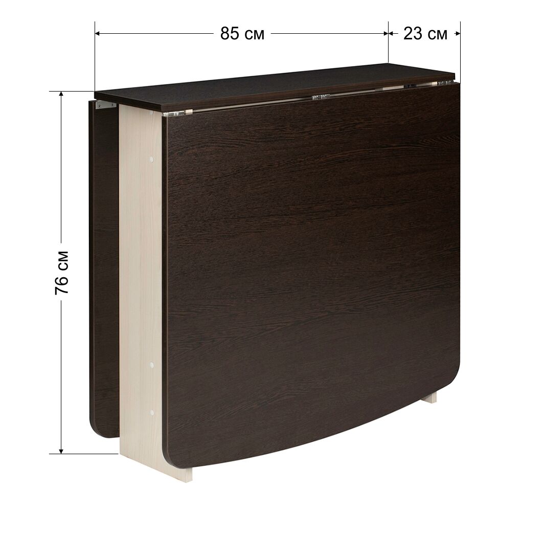 Стол-книжка «Колибри 14» – модель, которая идеально подойдет для малогабаритных квартир. Преимуществом модели является практичность и компактность. Стол может быть использован в нескольких положениях: в собранном виде (ширина составляет всего 23 см) – в качестве подставки или тумбы; в разложенном положении(1650см) – как стол, за которым комфортно сидеть гостям от 6 до 8 человек. Надежность и устойчивость конструкции обеспечивают 4 дополнительных опоры.Размер стола в собранном виде ДхГхВ 850х230х760