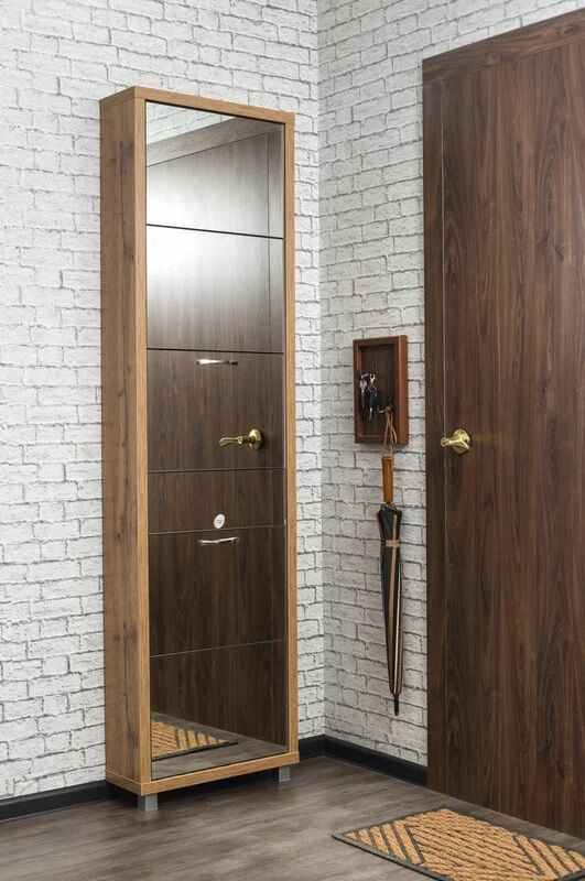 Обувной шкаф Айрон Люкс 5 дуб вотан зеркало» с пятью откидными секциями вмещает целых 10 пар обуви, занимая при этом минимум места. Корпус модели выполнен из высококачественного ЛДСП цвета благородного венге и усилен металлическими ребрами жесткости. Они служат надежной основой для крепления системы полок из оцинкованного листа с защитным полимерным покрытием. Великолепное решение: фасады образуют сплошную зеркальную панель в человеческий рост, визуально расширяя пространство прихожей и добавляя ему глубины. Благодаря веерному механизму трансформации секции синхронно открываются и выдвигаются вперед, что обеспечивает удобство в использовании. Возможна фиксация к стене при помощи дюбель-саморезов через технологические отверстия в верхней части.