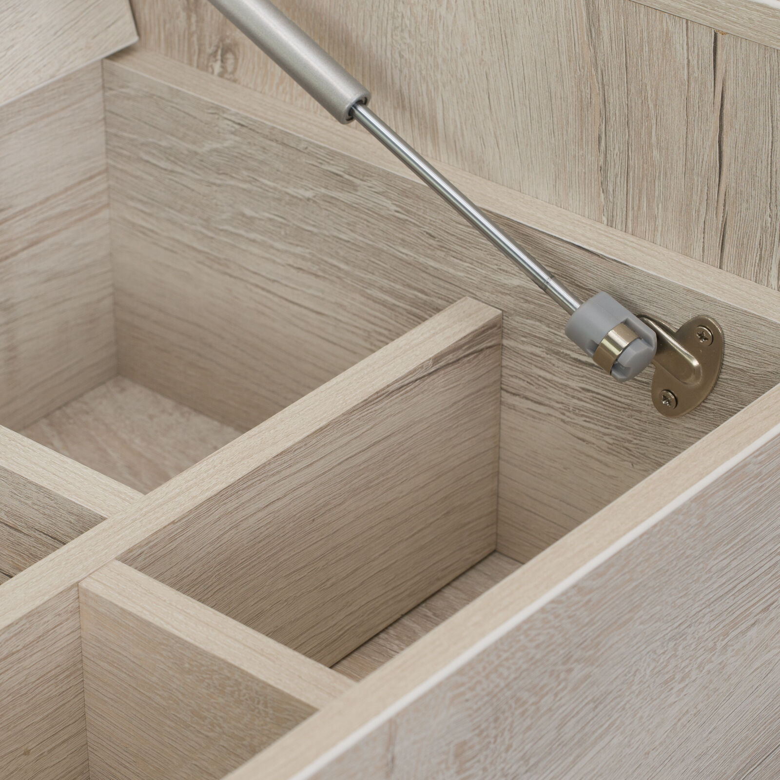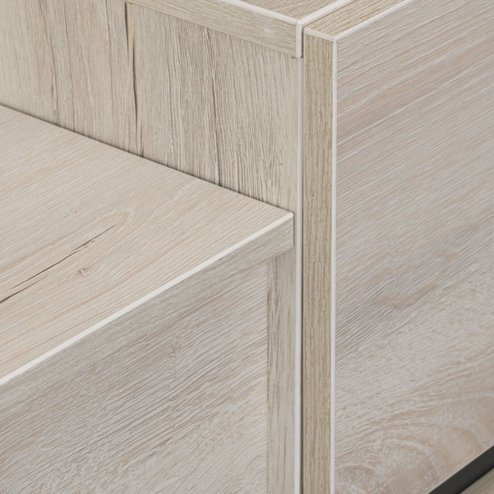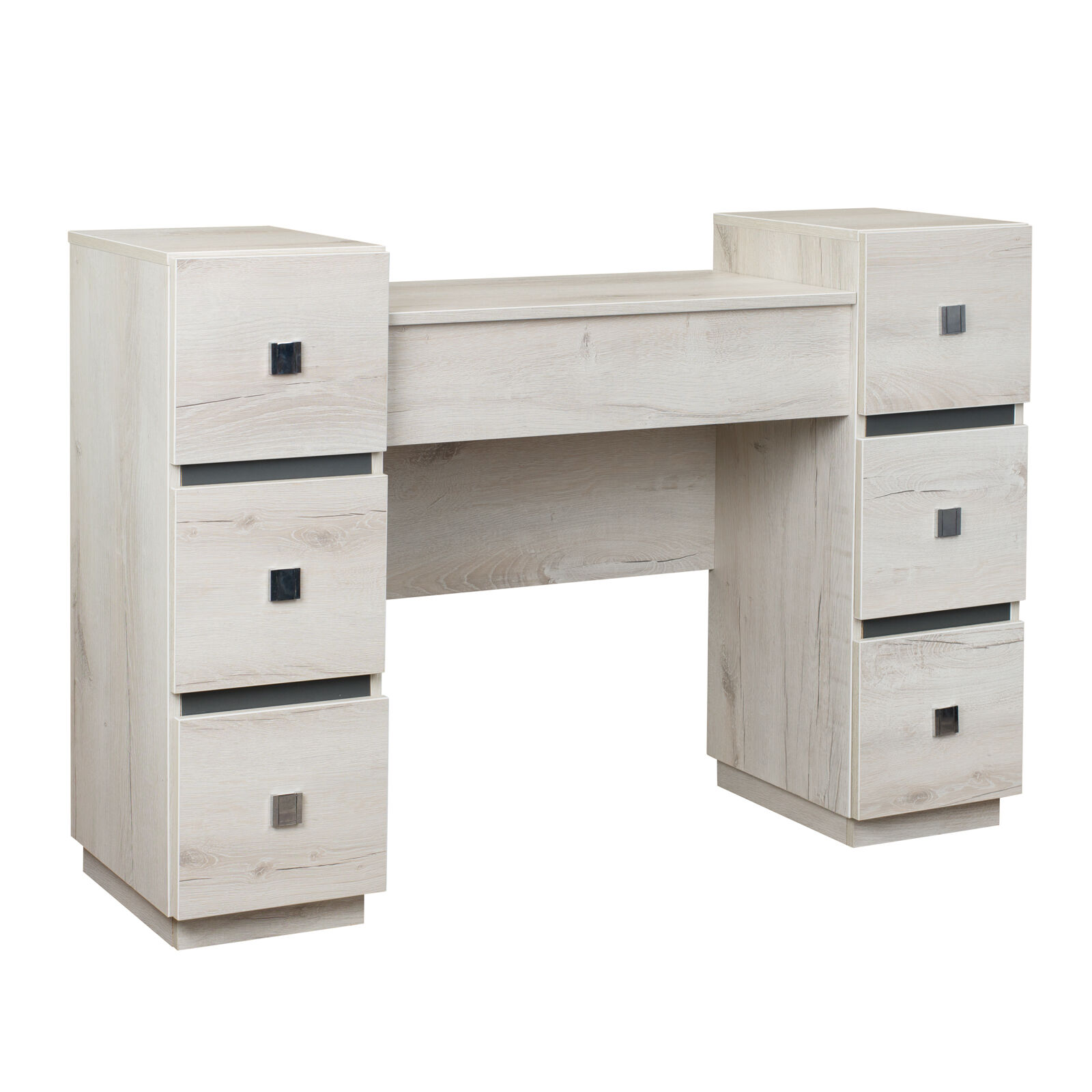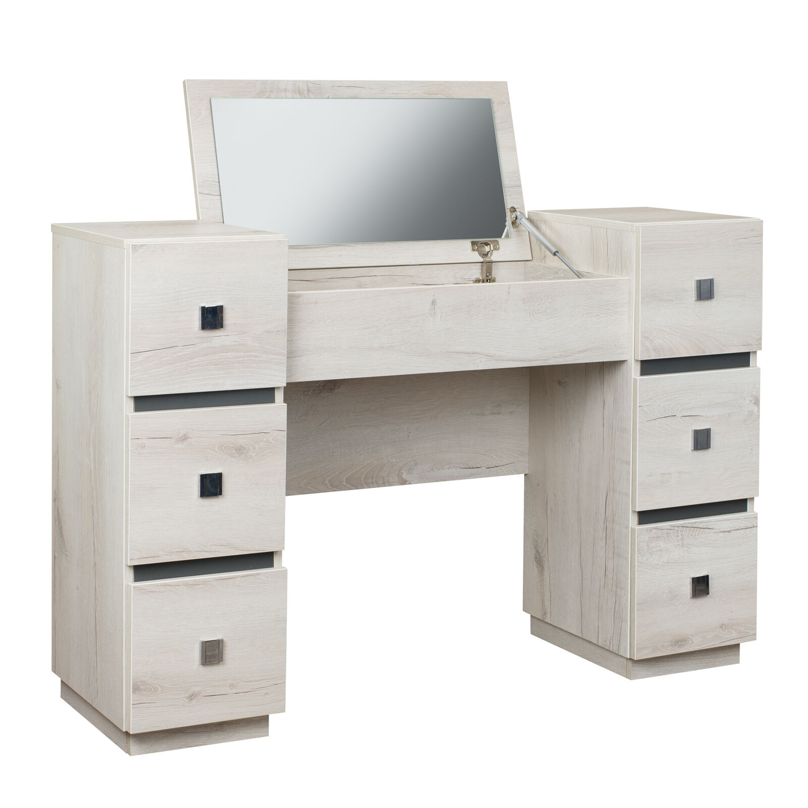Стол туалетный NEO 43 (спальня) Дуб Шавиниган Антрацит - он не займет много места в маленькой спальне. Разместите его в спальне у окна, и лучший естественный свет вам обеспечен. Откидная крышка стола с зеркалом скрывает нишу с делителем для хранения мелких аксессуаров, а в 6-ти выдвижных ящиках, глубиной 30 см, высотой 15 см и шириной 20 см, найдется место для множества баночек и флакончиков. Кроме того, ящики оснащены шариковыми направляющими, что обеспечивает их движению плавных ход и минимальный люфт. «Мебель поставляется в разобранном виде».