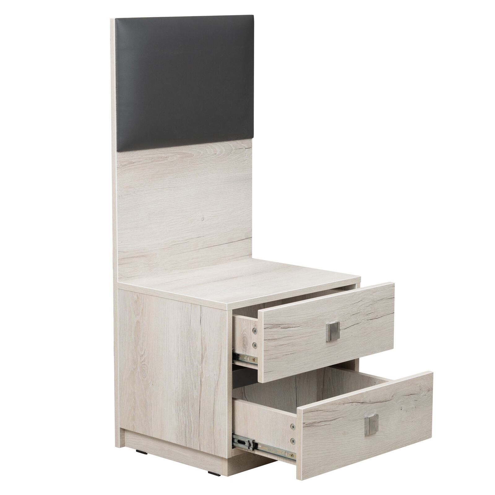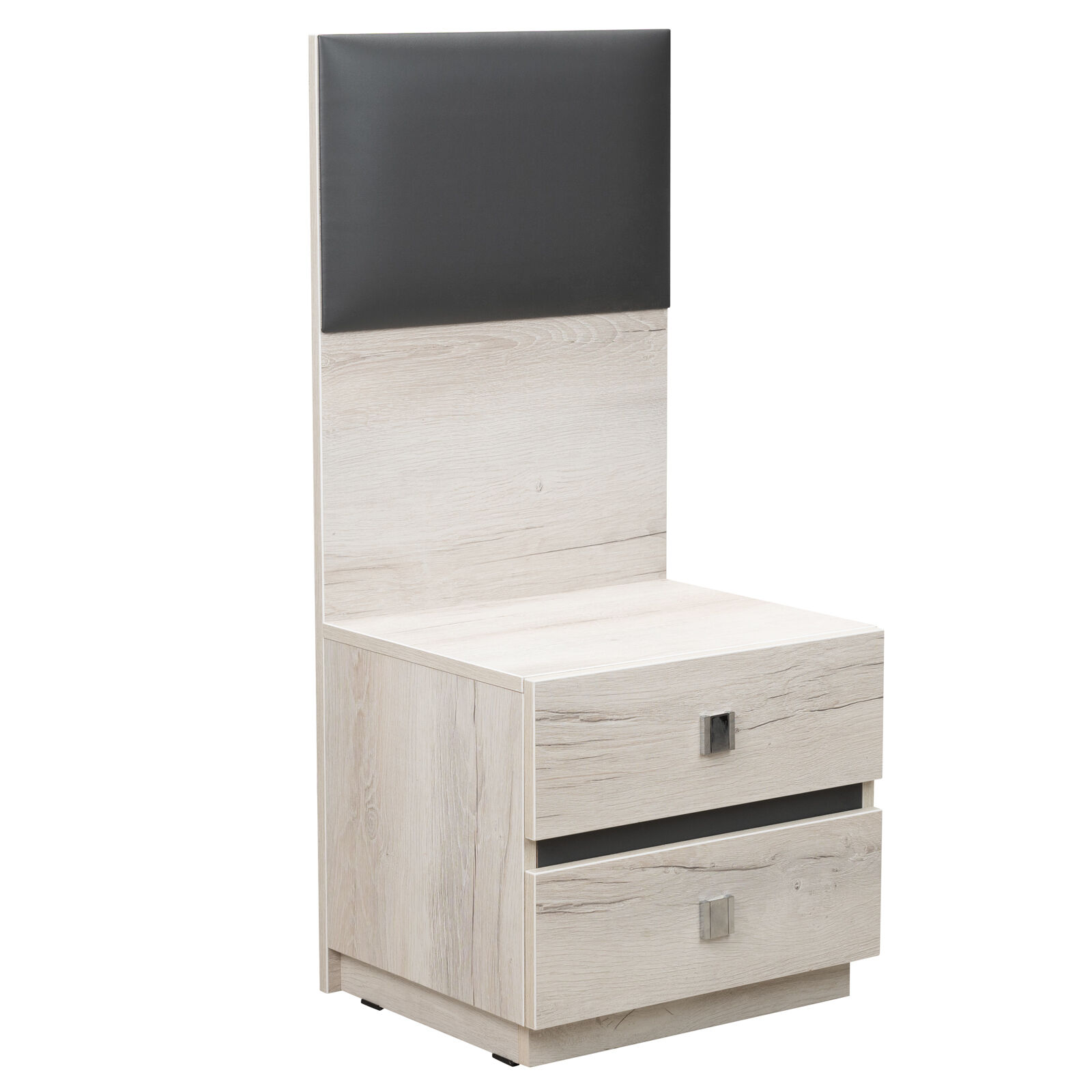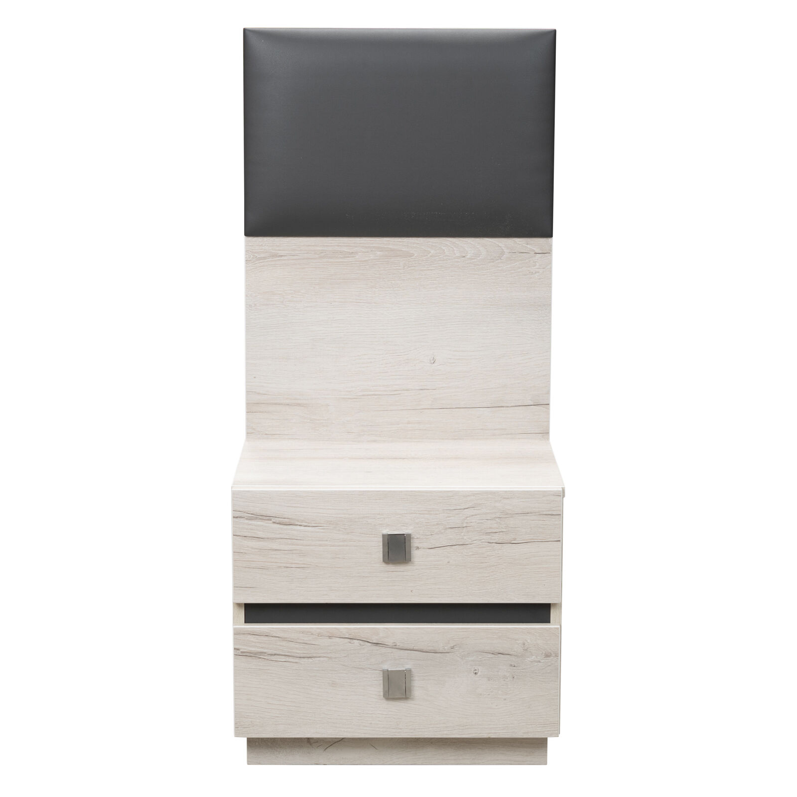 Тумба прикроватная NEO 41 (спальня) «Дуб Шавиниган Антрацит» с двумя выдвижными ящиками и высокой мягкой спинкой – красивый и функциональный модуль. Изюминка тумбы - комбинированная задняя стенка, возвышающаяся над столешницей: ее нижняя часть из ЛДСП, а верхняя с подушечкой из экокожи цвета Асфальт. Когда тумба приставлена к кровати, тогда она составляет единую композицию с изголовьем. Дополняют тумбу интересные ручки на ящиках: в обычном состоянии - это плоские прямоугольные кнопки, а при необходимости выдвинуть ящик средняя часть приподнимается кончиками пальцев. «Мебель поставляется в разобранном виде».