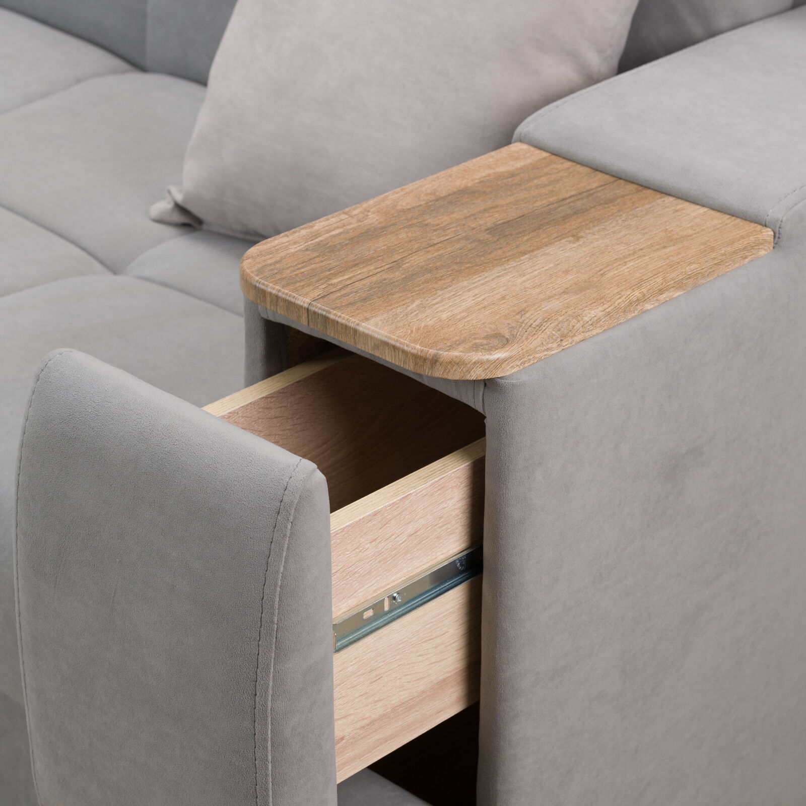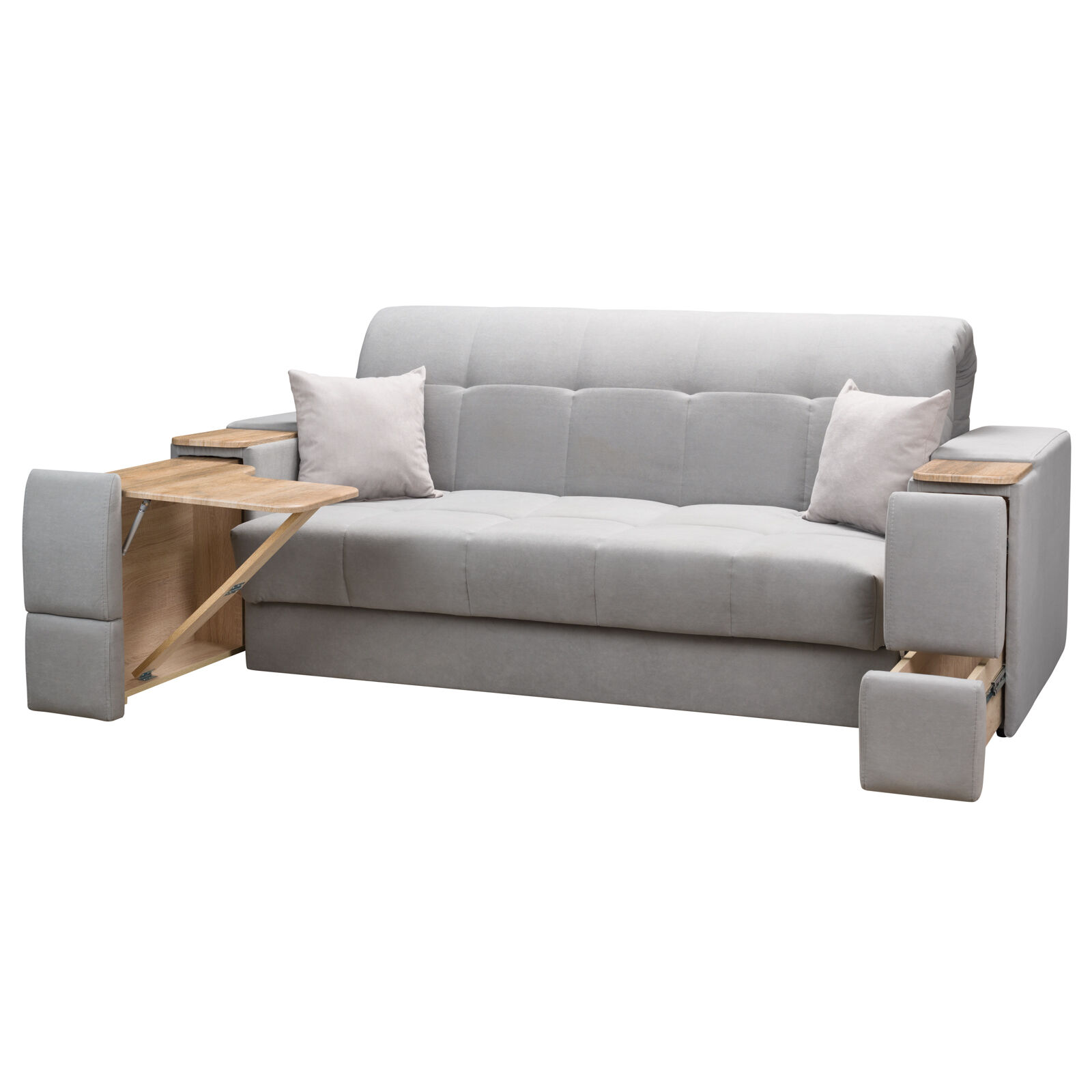 Диван Токио 4 БД №165 LUMA 14 LUMA 13 Дуб золотистый, оснащен выдвижным столиком из подлокотника, что позволяет комфортно отдохнуть после рабочего дня. Другой подлокотник оборудован выдвижными ящиками для хранения различных вещей. Такая мебель значительно экономит пространство в помещении и несомненно делает отдых на диване комфортнее, ведь буквально под рукой есть стол, на который можно поставить бокал, положить книгу или журнал. «Мебель поставляется в разобранном виде».