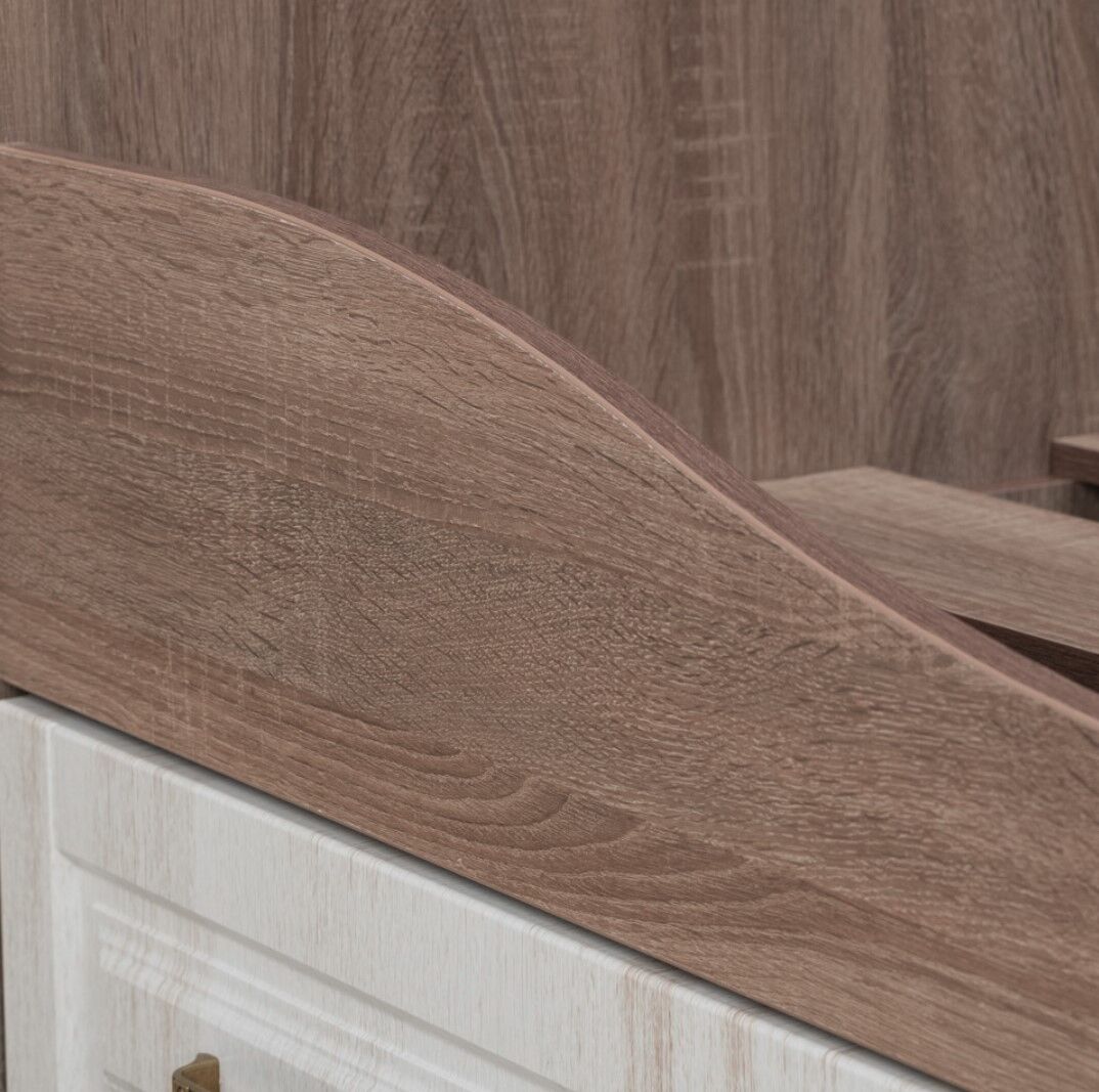 Кровать «Афина» содержит выдвижные ящики, которые могут быть использованы, как места хранения. Она выполнена в светлом декоре «Кантри», теплый и мягкий оттенок которого наполняет пространство уютом, а контрастный дуб винтаж с насыщенной древесной структурой придает коллекции особый шарм. «Мебель поставляется а рвзобранном виде». «Матрас в комплект не входит».