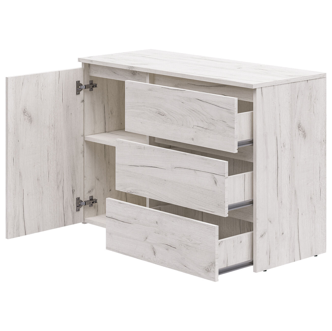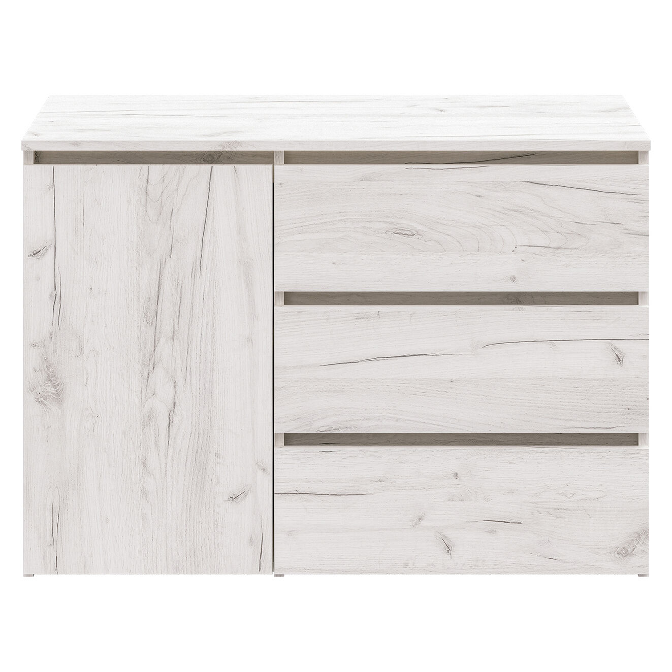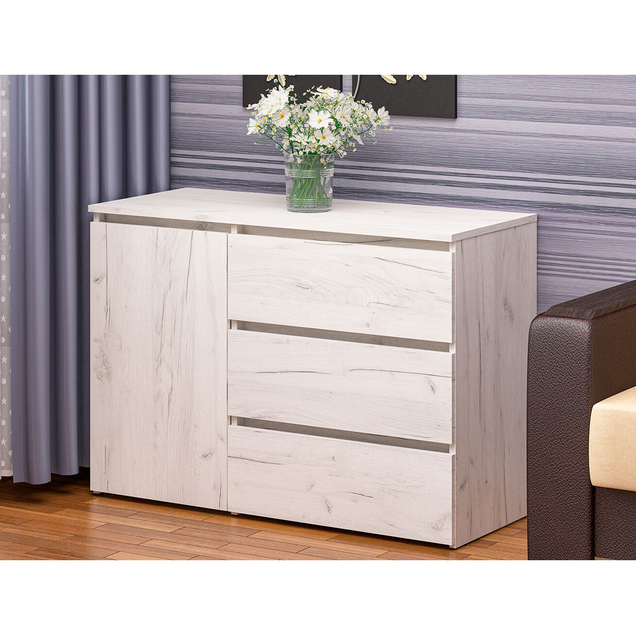 Комод 26 Крафт светлый. Вместительный комод обеспечит универсальную систему хранения. Оснащение: три ящика полного выдвижения бесшумного плавного хода, распашной шкафчик с двумя нишами. Регулируемые скрытые опоры компенсируют возможные неровности пола, надёжный материл гарантирует долговечность. Лаконичная модель функциональна и может быть адаптирована под различные потребности и условия. «Мебель поставляется в разобранном виде»