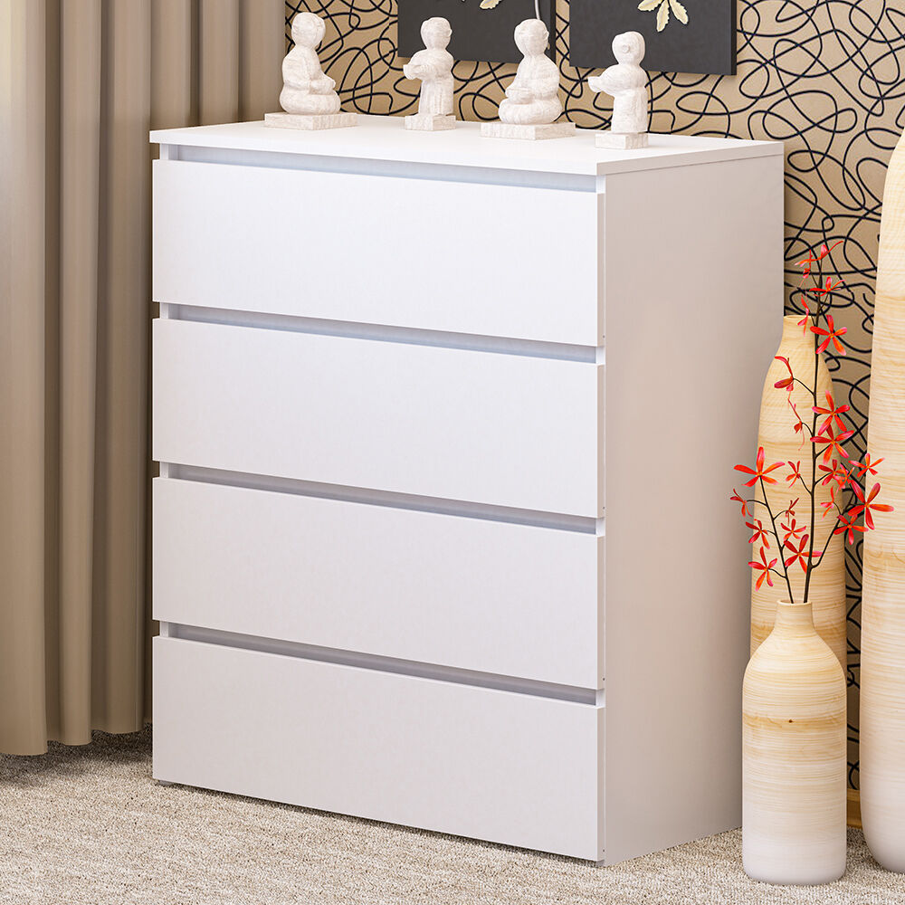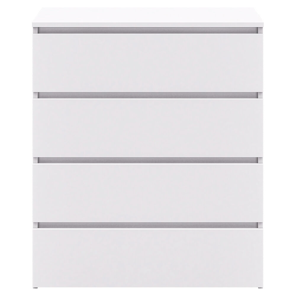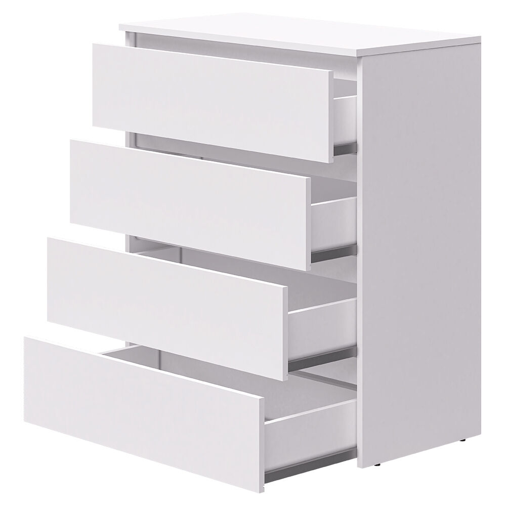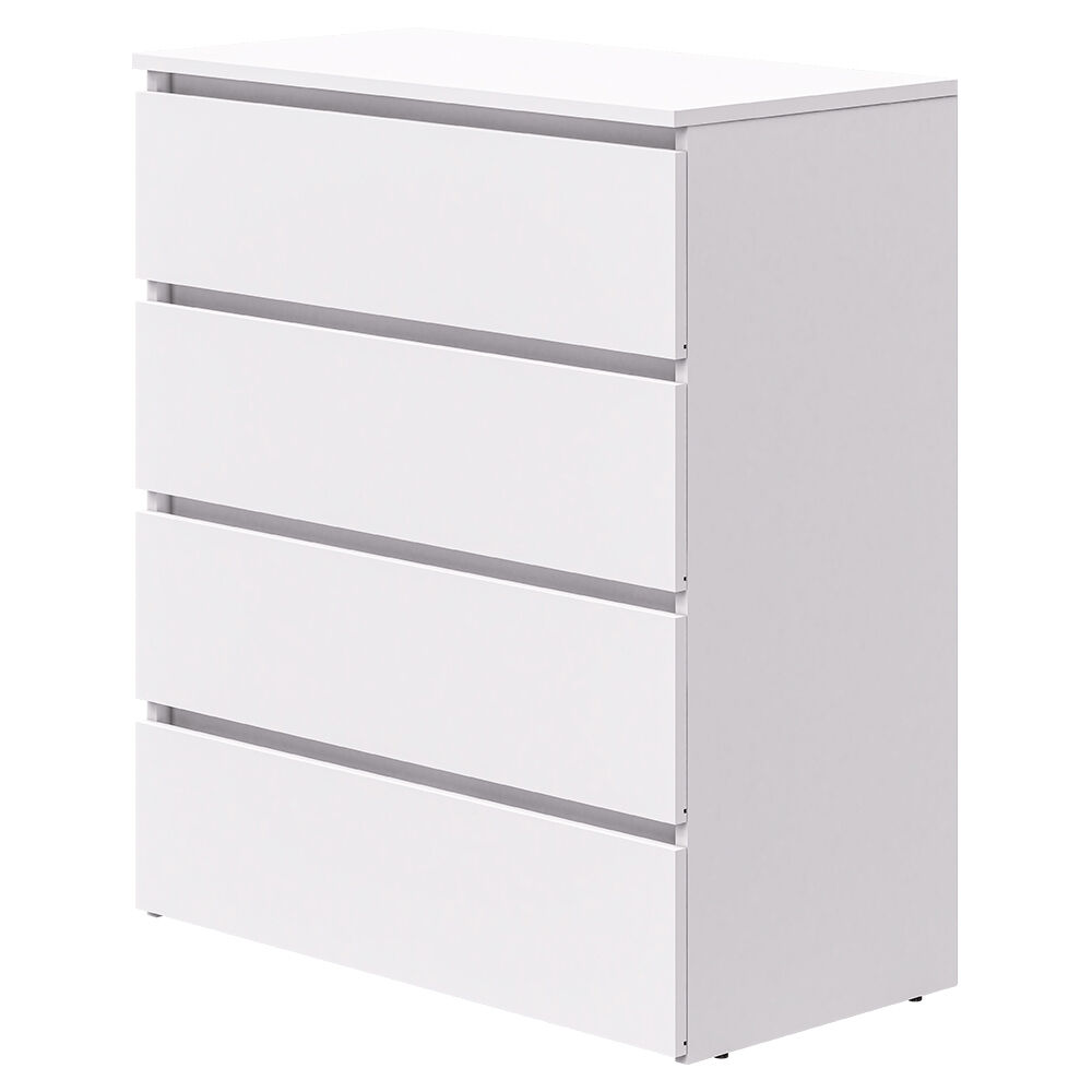 Комод 24 Белый. Вместительный комод обеспечит универсальную систему хранения. Оснащение: четыре ящика полного выдвижения бесшумного плавного хода. Регулируемые скрытые опоры компенсируют возможные неровности пола, надёжный материл гарантирует долговечность. Лаконичная модель функциональна и может быть адаптирована под различные потребности и условия. «Мебель поставляется в разобранном виде».