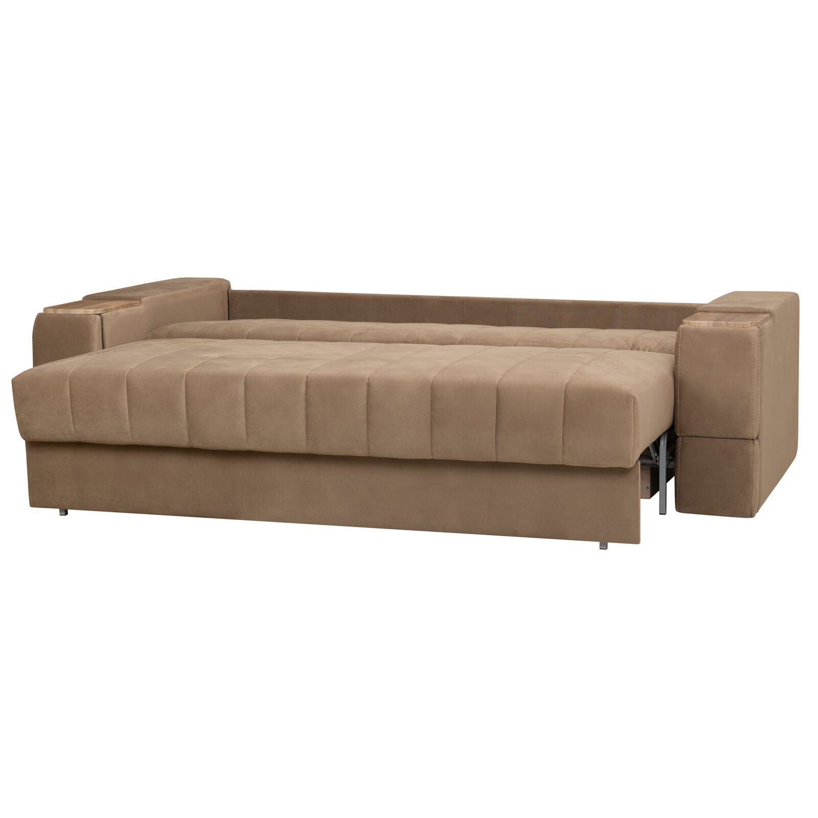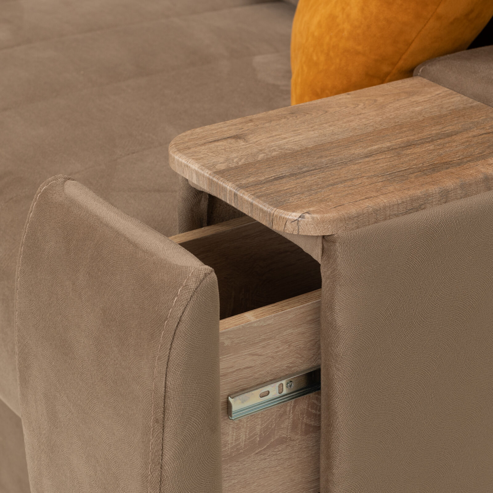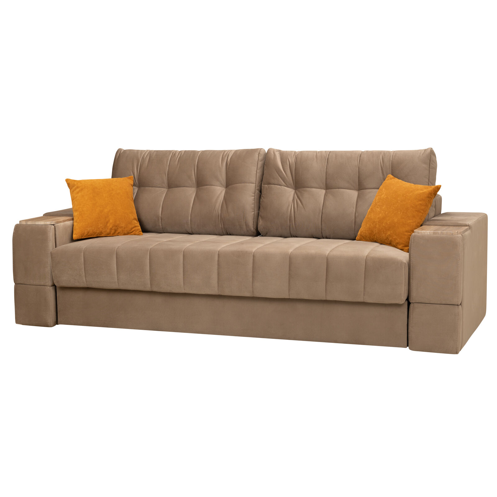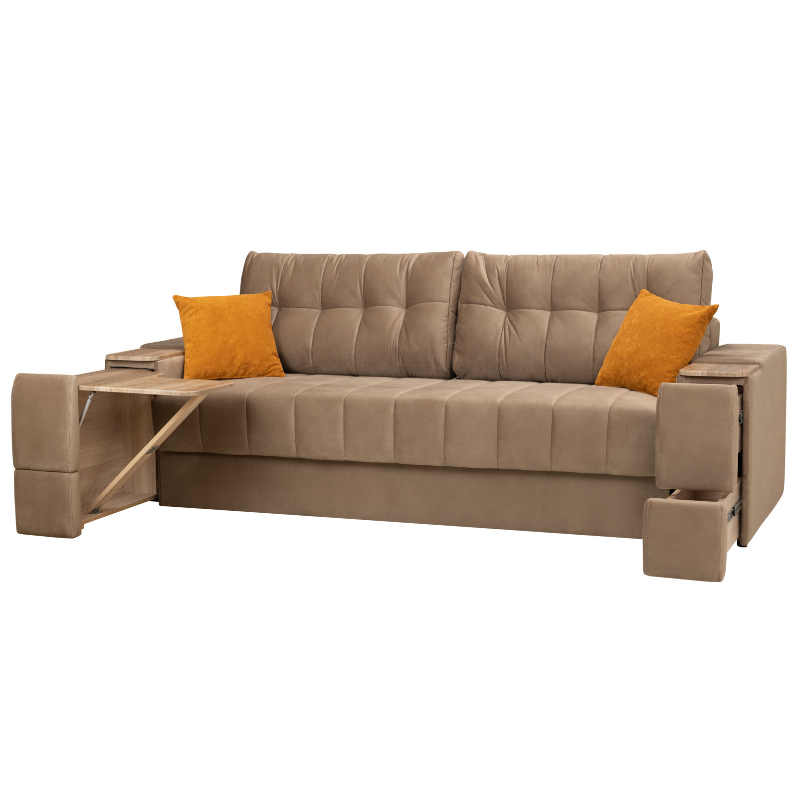 Диван Камелот 4 БД НПБ КАРАТ 26 Дуб золотистый оснащен выдвижным столиком из подлокотника, что позволяет комфортно отдохнуть после рабочего дня. Другой подлокотник оборудован выдвижными ящиками для хранения различных вещей. Такая мебель значительно экономит пространство в помещении и несомненно делает отдых на диване комфортнее, ведь буквально под рукой есть стол, на который можно поставить бокал, положить книгу или журнал. «Мебель поставляется в разобранном виде».