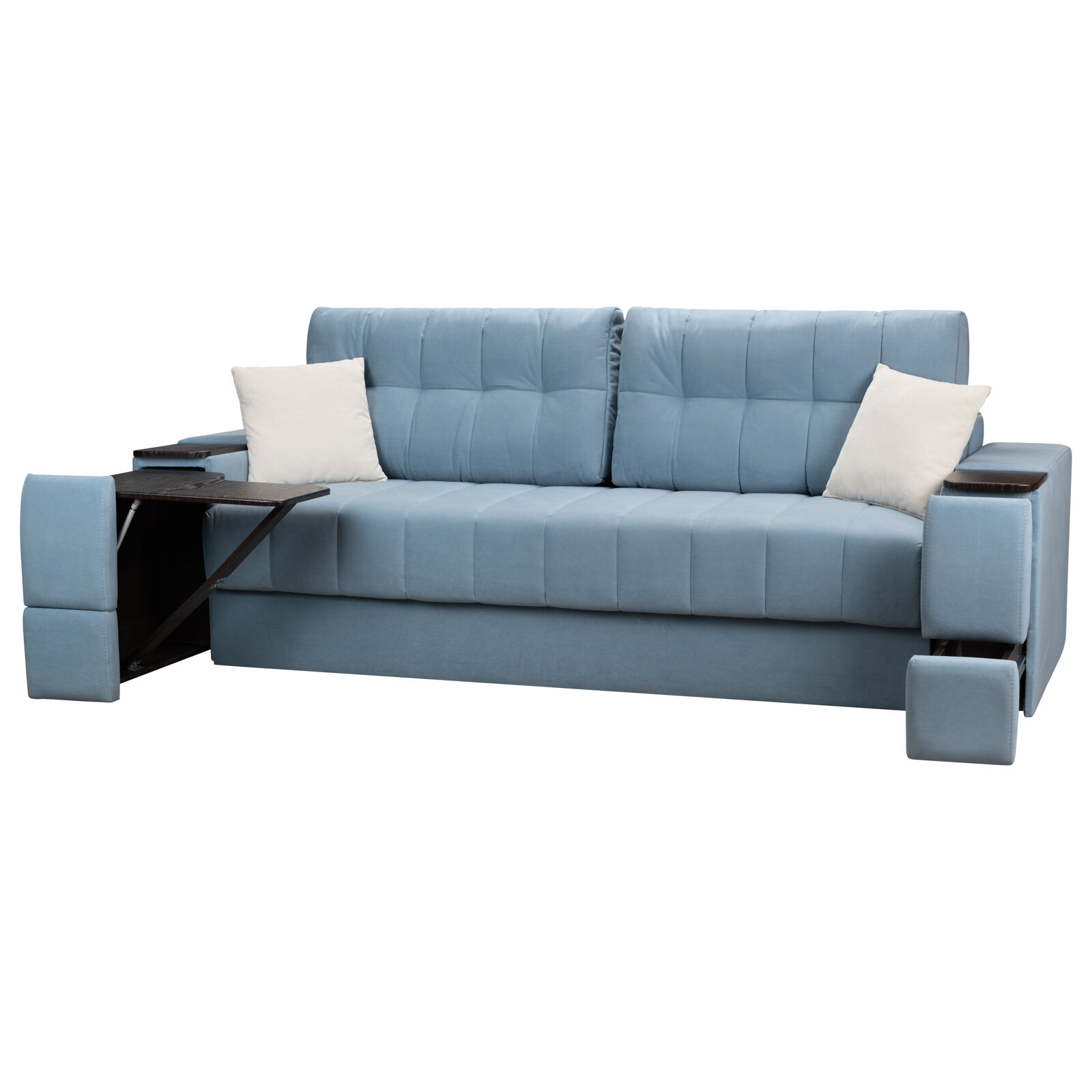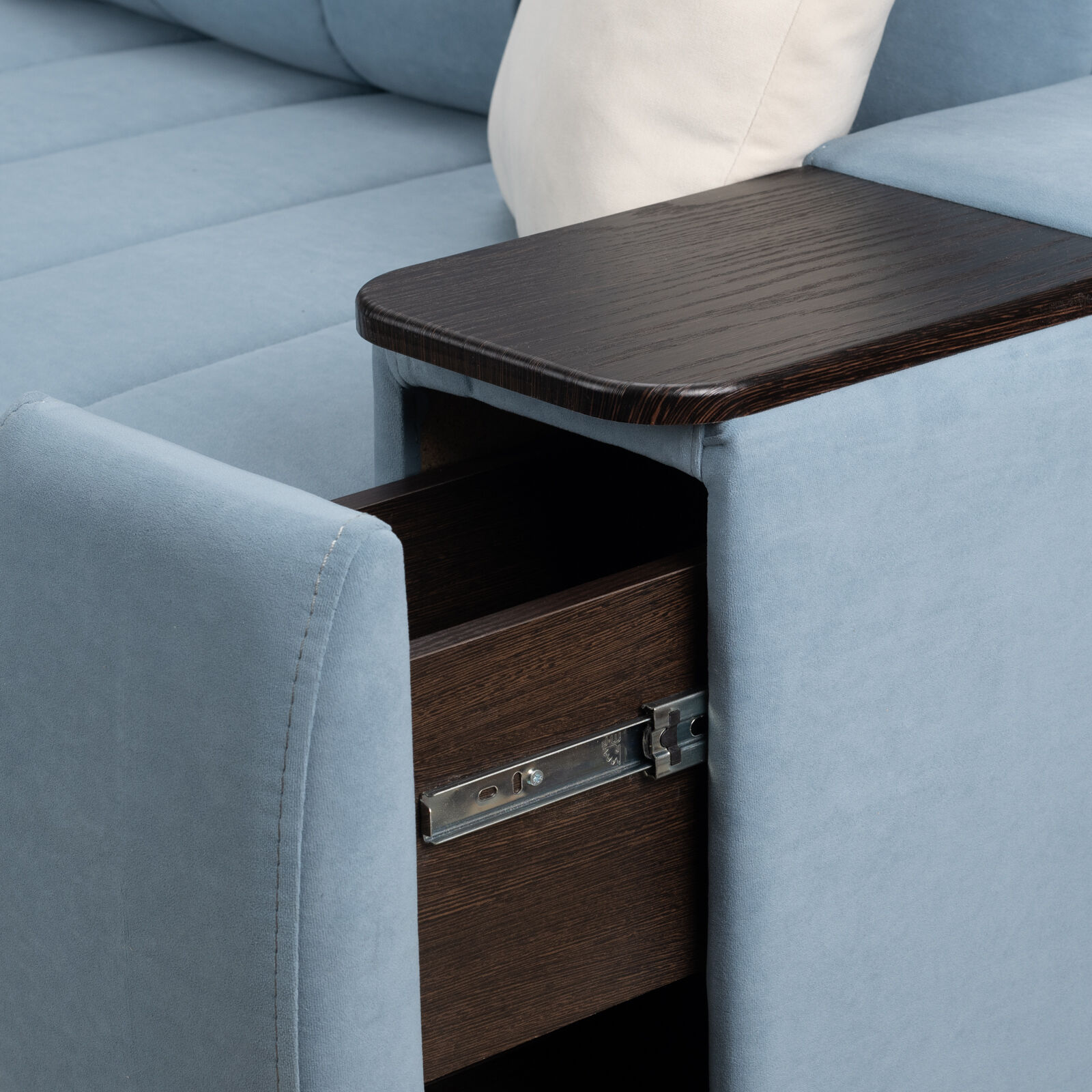 Диван Камелот 4 БД НПБ MODUS 17 Венге оснащен выдвижным столиком из подлокотника, что позволяет комфортно отдохнуть после рабочего дня. Другой подлокотник оборудован выдвижными ящиками для хранения различных вещей. Такая мебель значительно экономит пространство в помещении и несомненно делает отдых на диване комфортнее, ведь буквально под рукой есть стол, на который можно поставить бокал, положить книгу или журнал. «Мебель поставляется в разобранном виде».