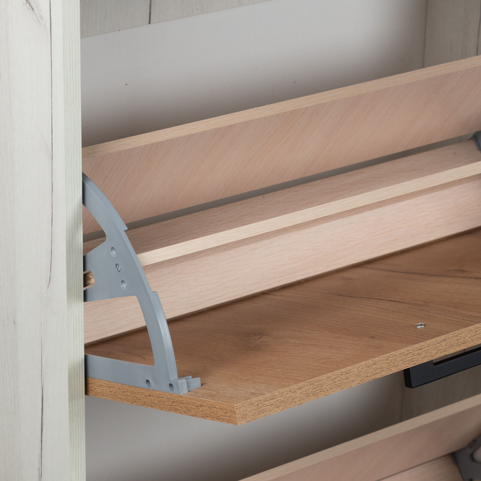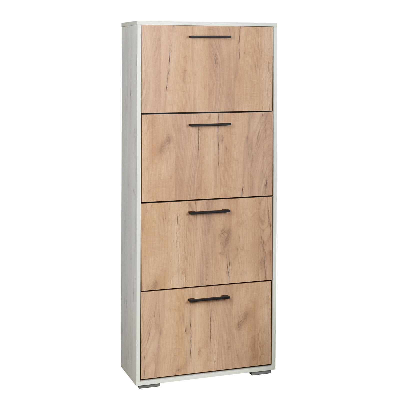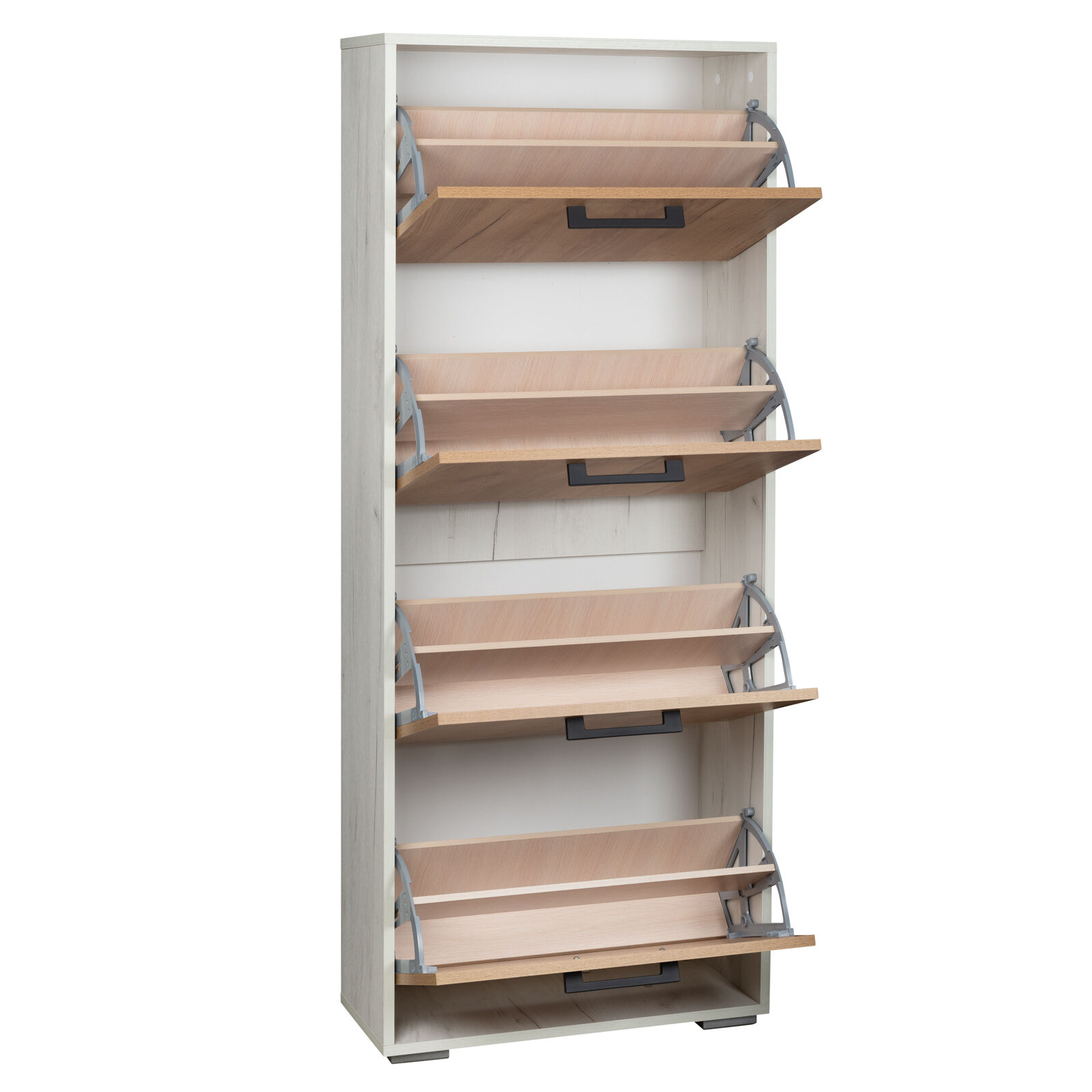 Узкая обувница с четырьмя ящиками «ОБ-5» Закрытая компактная тумба для обуви с четырьмя вместительными откидными ящиками, приспособленных под хранение, по две секции с хорошей вместимостью в каждом. Регулируемые скрытые опоры цвета «хром» компенсируют возможные неровности пола.