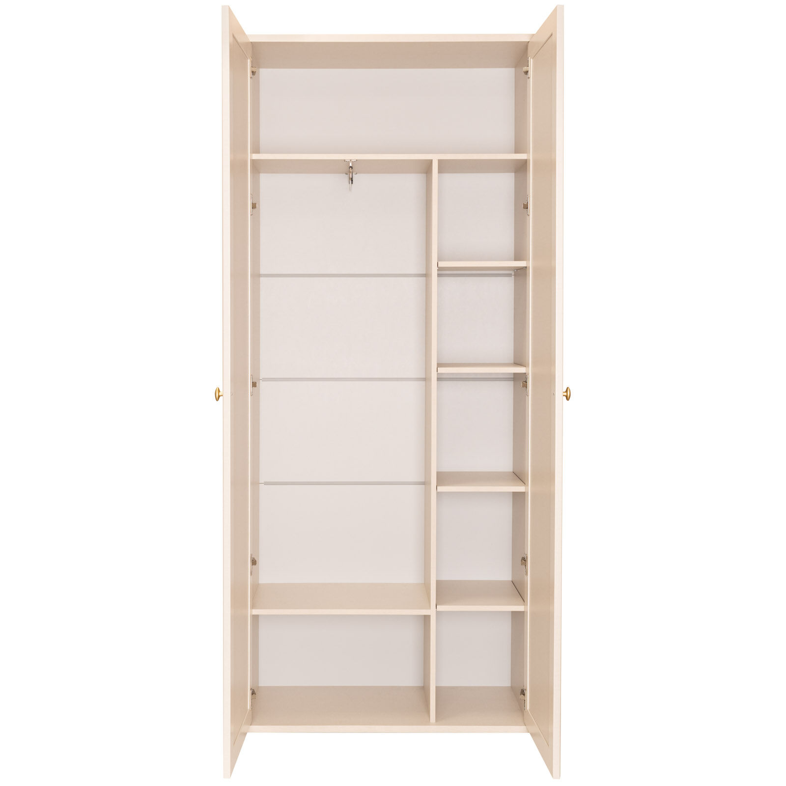 Этот двустворчатый шкаф решит проблему размещения массы вещей и содержания их в идеальном порядке: в секции с поперечной штангой поместится немало вешалок с верхней одеждой, в секции с рядом горизонтальных полок найдут свое место обувные коробки, на полке в нижней части шкафа удобно расположить уличную или домашнюю обувь, а антресольная полка отлично подойдет для аксессуаров и головных уборов. В надежности и практичности шкафа сомневаться не приходится, ведь он выполнен из прочного ЛДСП современного поколения, фасады обрамлены рамочным профилем из МДФ.