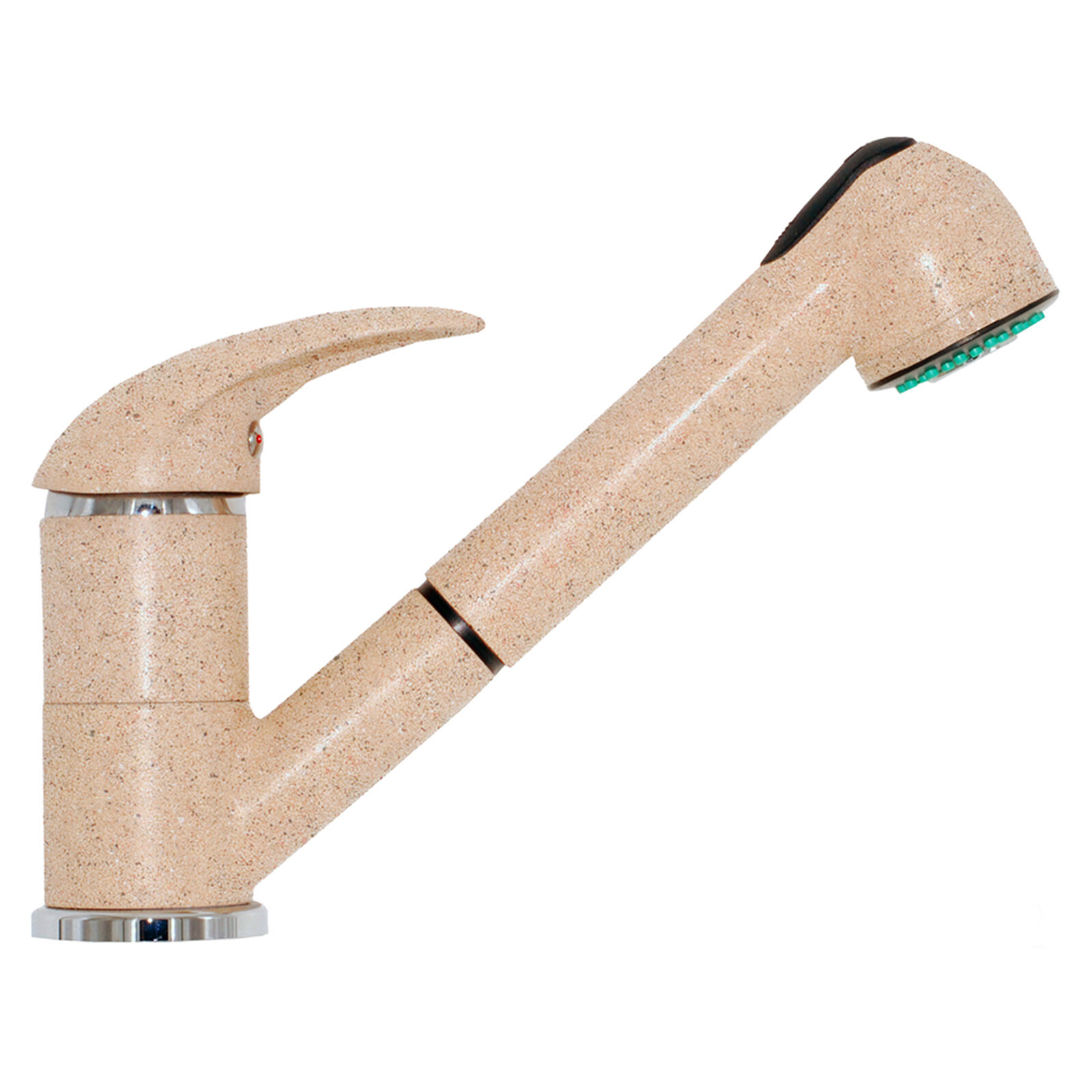 Смеситель с душевой лейкой «№302 песочный» очень удобен для мытья крупной посуды. Излив смесителя поворотный, лейка имеет 2 режима. Покрытие смесителя идентично по цветам с мойками Polygran.