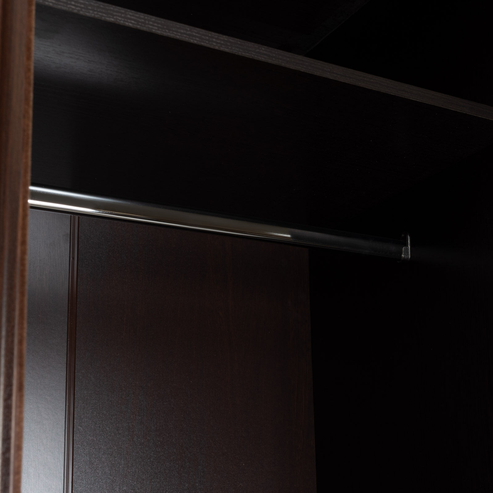 В шкафу-купе шириной 160 см найдется место для белья, верхней одежды и аксессуаров. Продуманное внутреннее наполнение шкафа состоит из стеллажа для белья, четырех больших ниш внизу и вверху, а также стационарной штанги длиной больше метра.