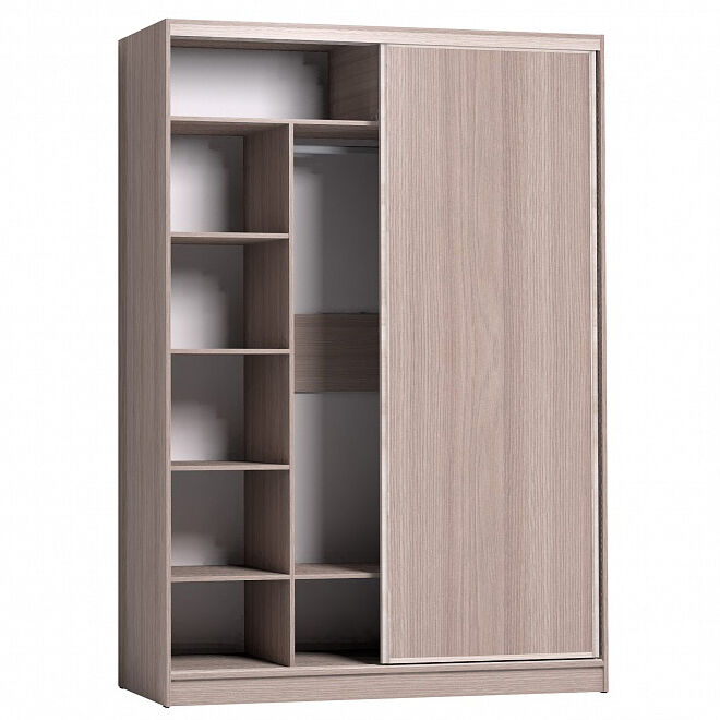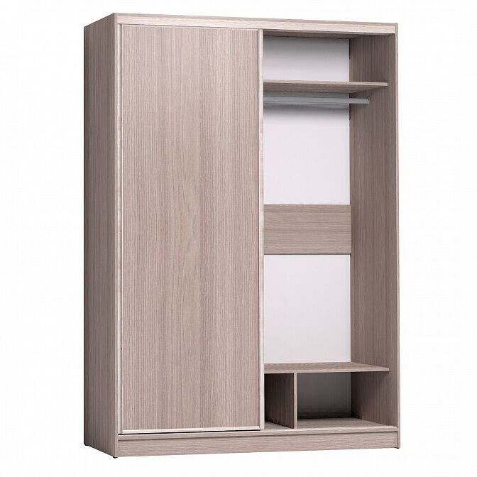В шкафу-купе шириной 160 см найдется место для белья, верхней одежды и аксессуаров. Продуманное внутреннее наполнение шкафа состоит из стеллажа для белья, четырех больших ниш внизу и вверху, а также стационарной штанги длиной больше метра.