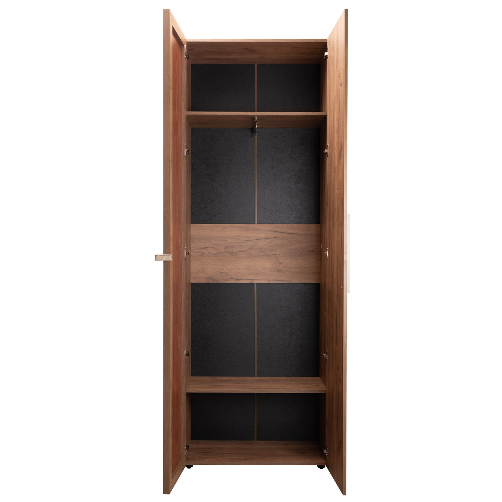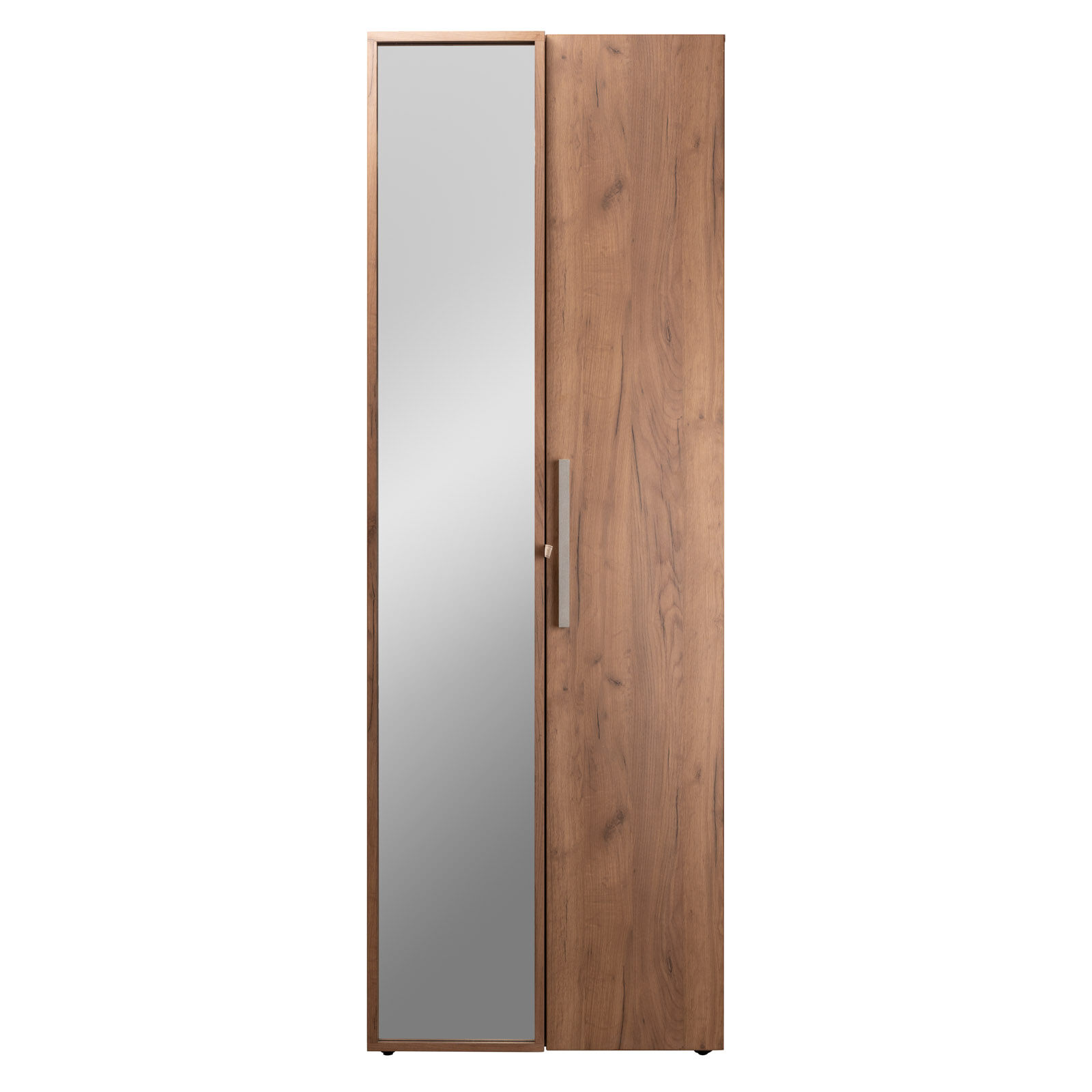 Двухдверный распашной шкаф с одним глухим фасадом и одним зеркальным фасадом в раме «Nature 92 Дуб табачный Craft» Глухой фасад с серой ручкой из массива, фасад Зеркало Контур открывается за ручку-петлю из высокопрочной микрофибры. Регулируемые опоры компенсируют незначительные неровности пола. «Мебель поставляется в разобранном виде».