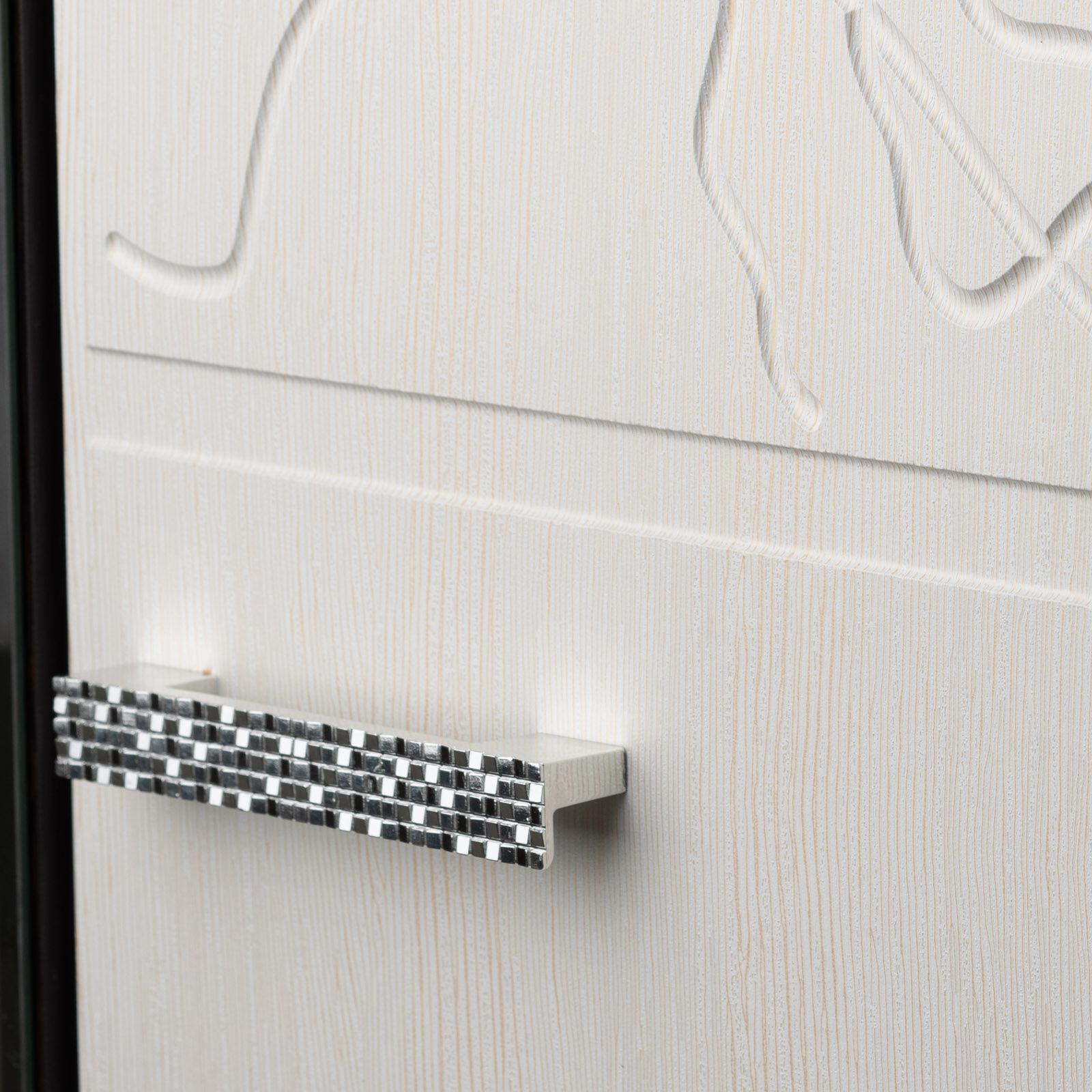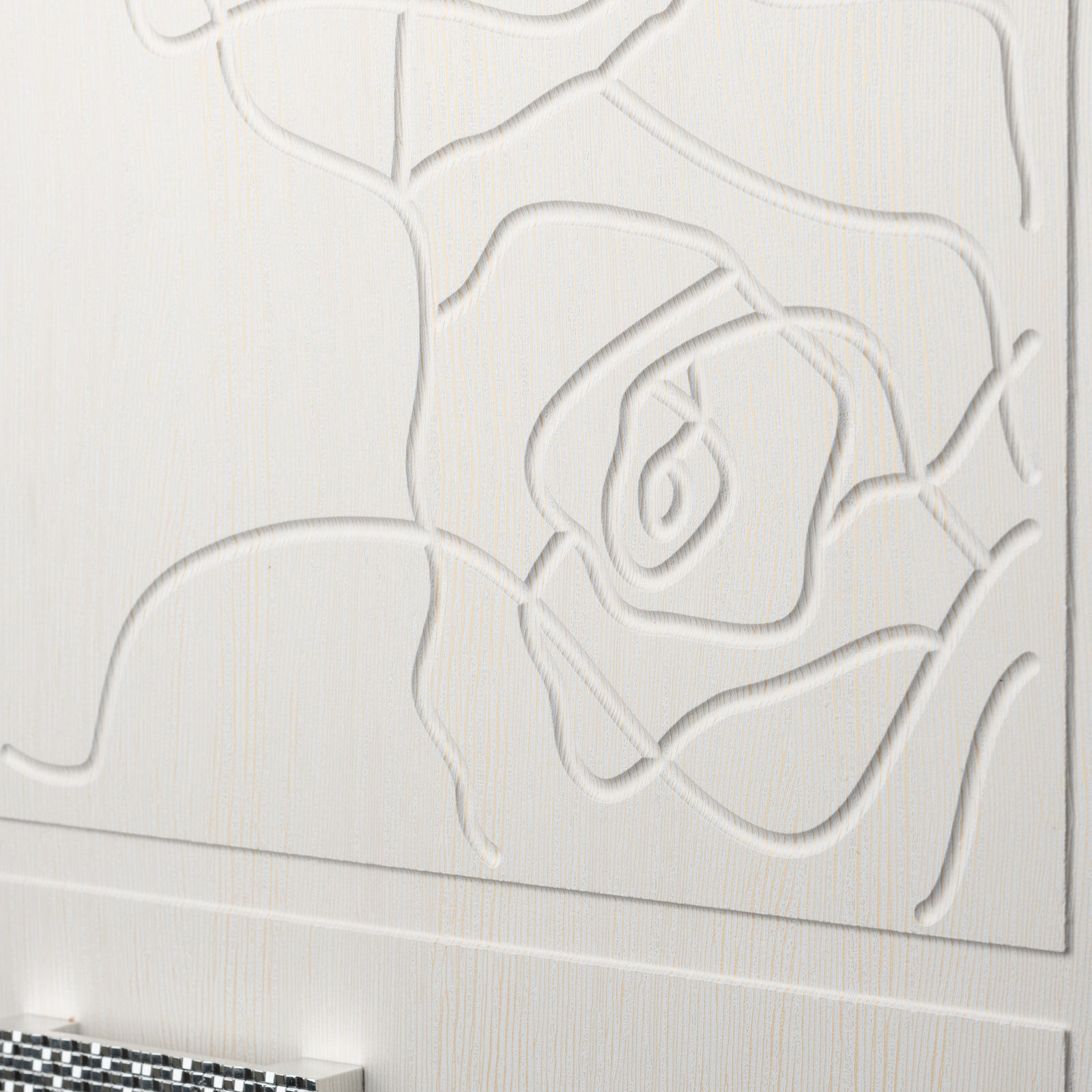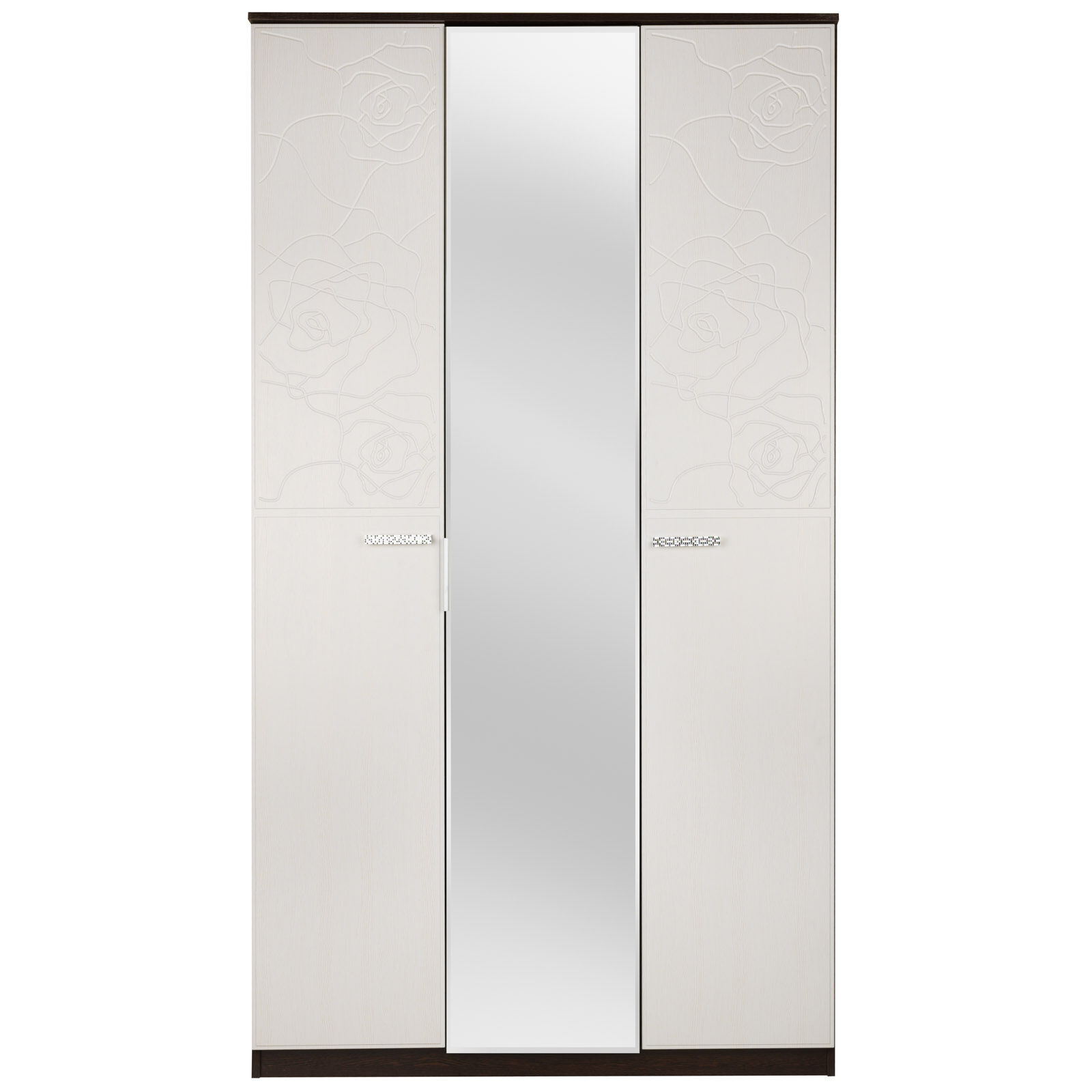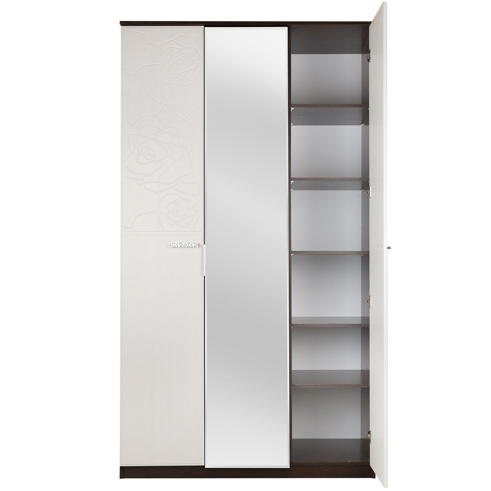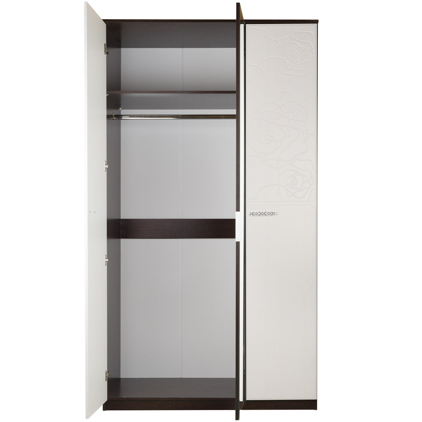 Шкаф состоит из двух отделений. Фасад украшен объёмным рисунком, имитирующим распустившиеся розы.