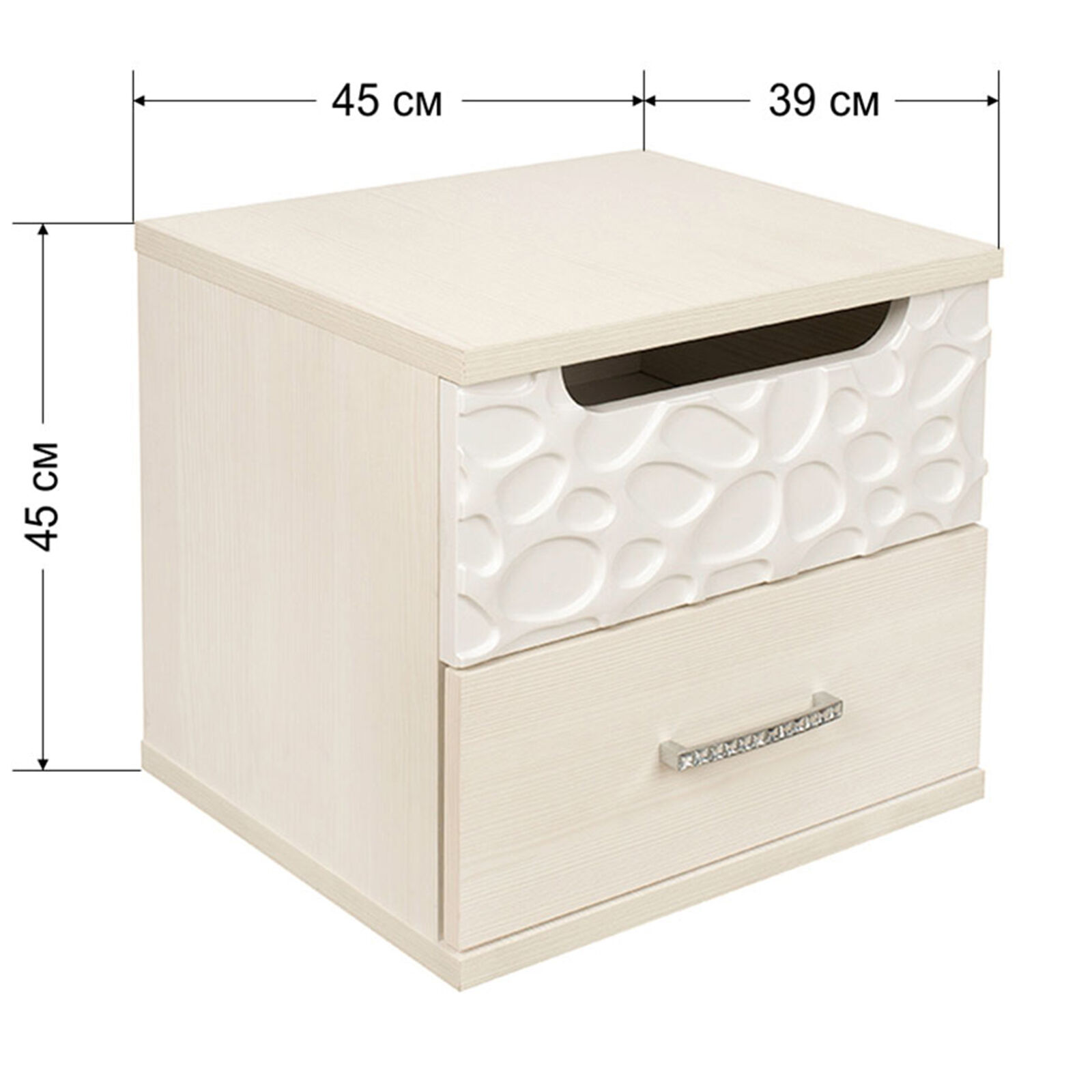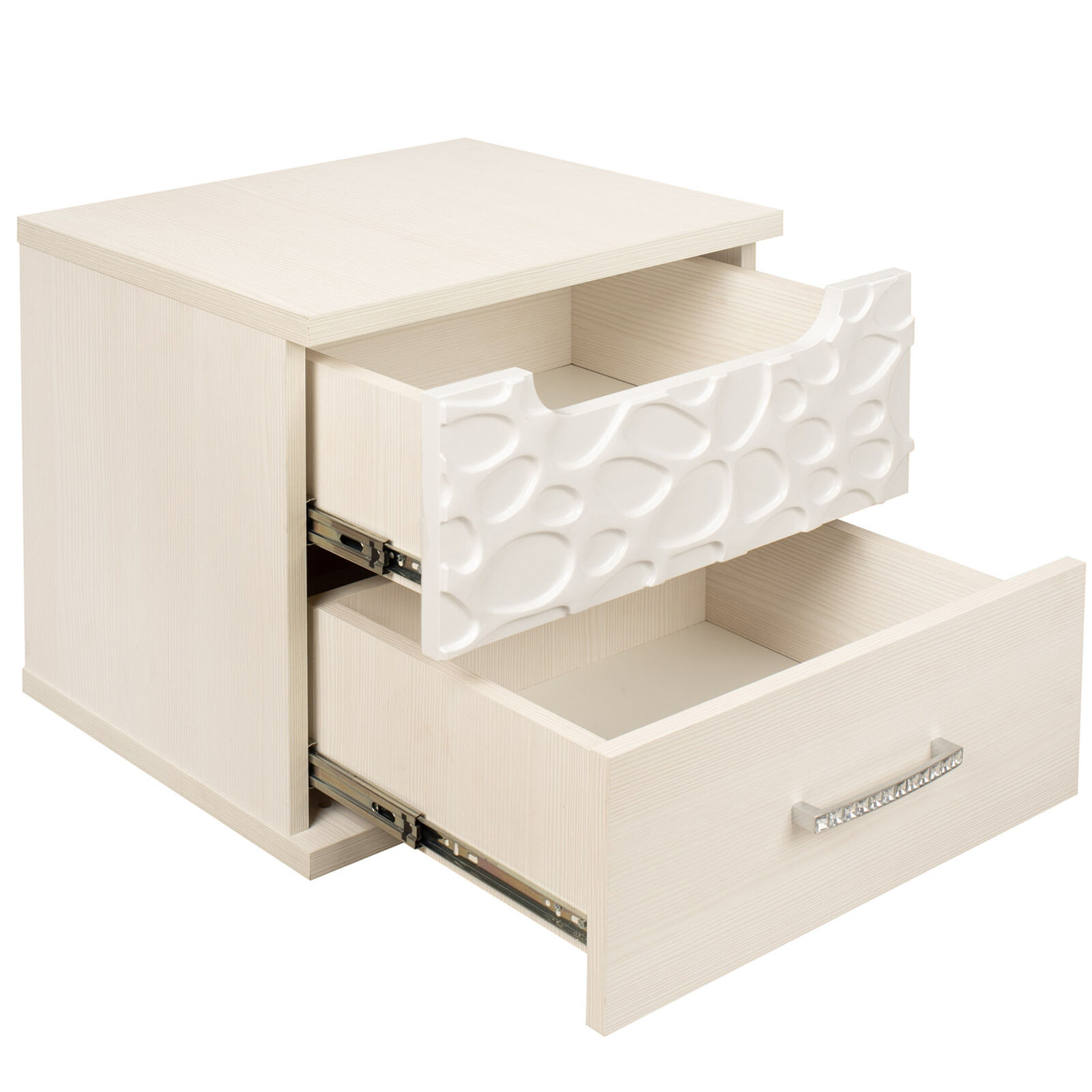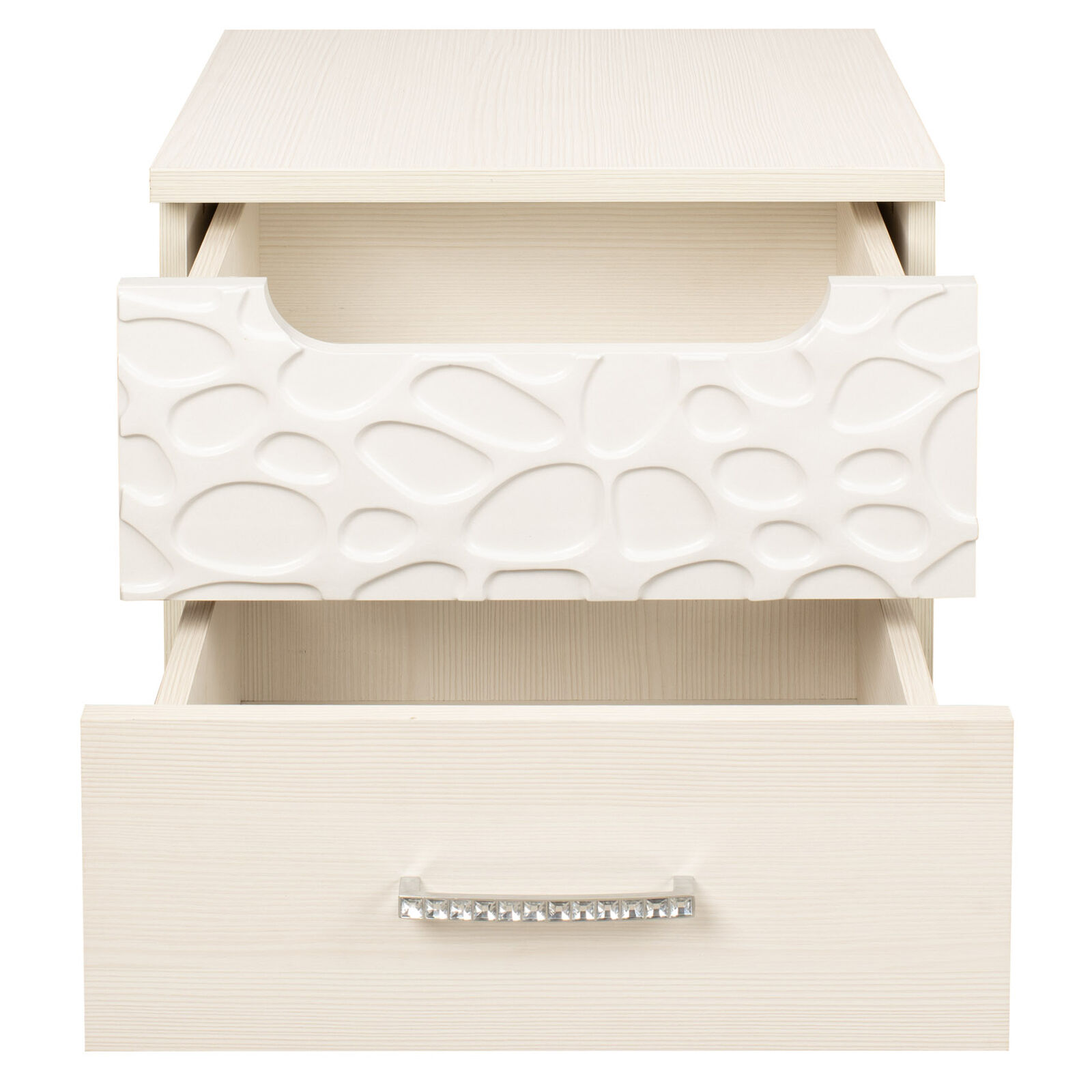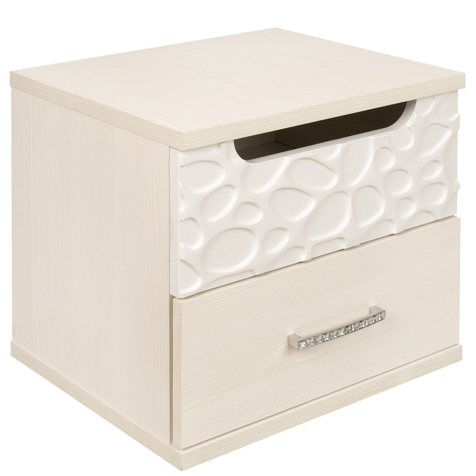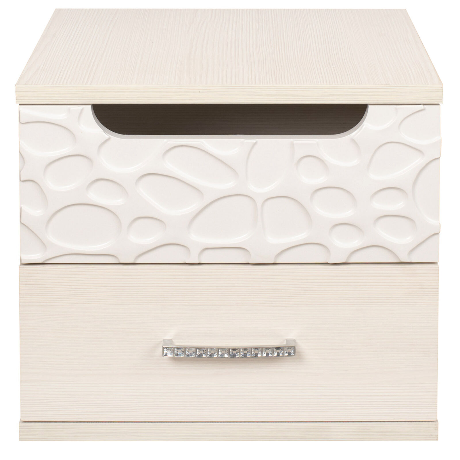 Тумба прикроватная «WYSPAA 33 бодега светлый» с двумя ящиками. Верхний ящик с «пузырьками» на фасаде открывается за фигурный вырез. «Мебель поставляется в разобранном виде».