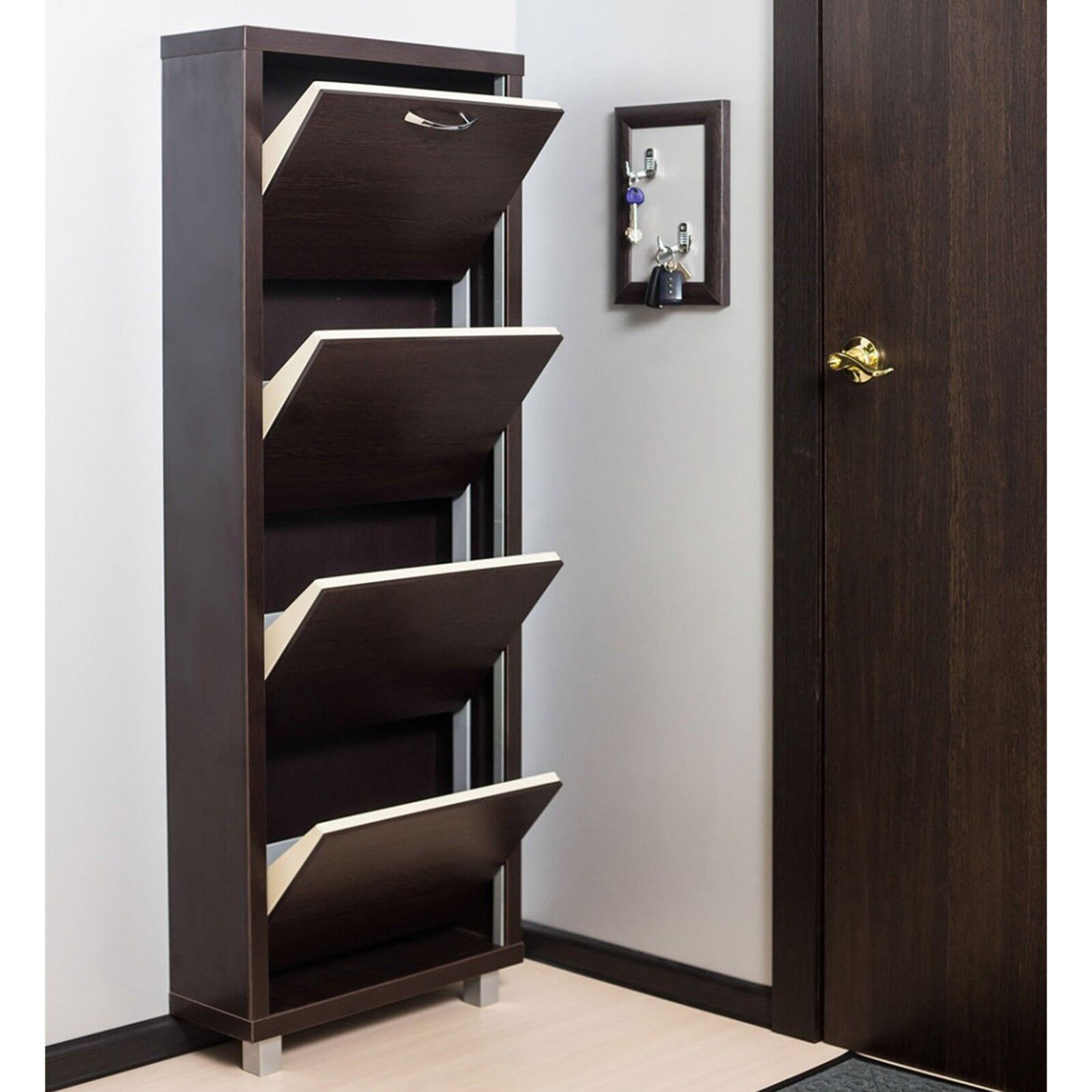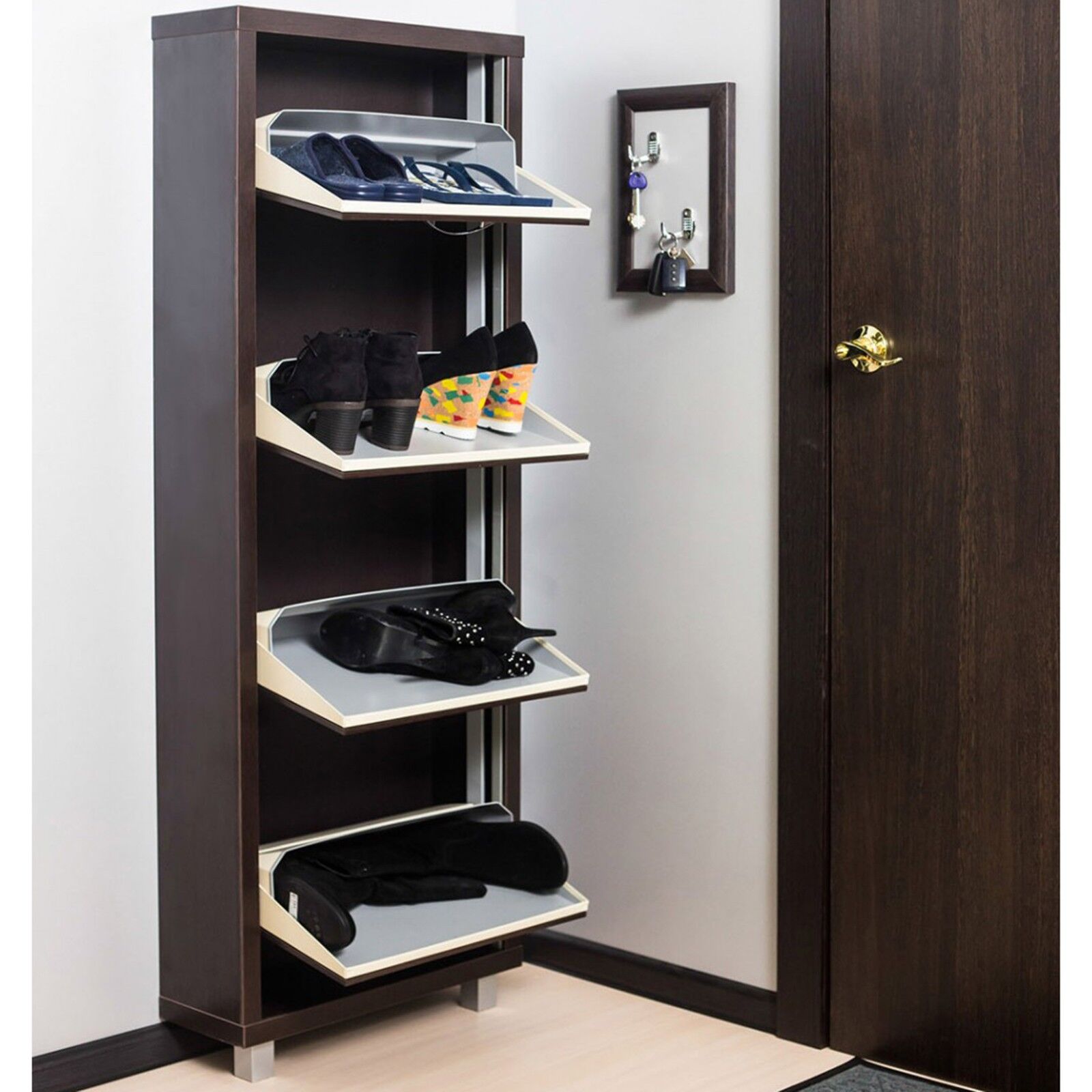 Обувной шкаф «Айрон Люкс 4 венге-венге» представляет собой весьма вместительную и многофункциональную мебель. Она сочетает все необходимые функции, которые позволяют удобно и аккуратно хранить и размещать около 8 пар обуви одновременно. Для надежности можно закрепить обувницу к стене через специальные технологические отверстия. Система лотков: оцинкованный лист с полимерным покрытием.