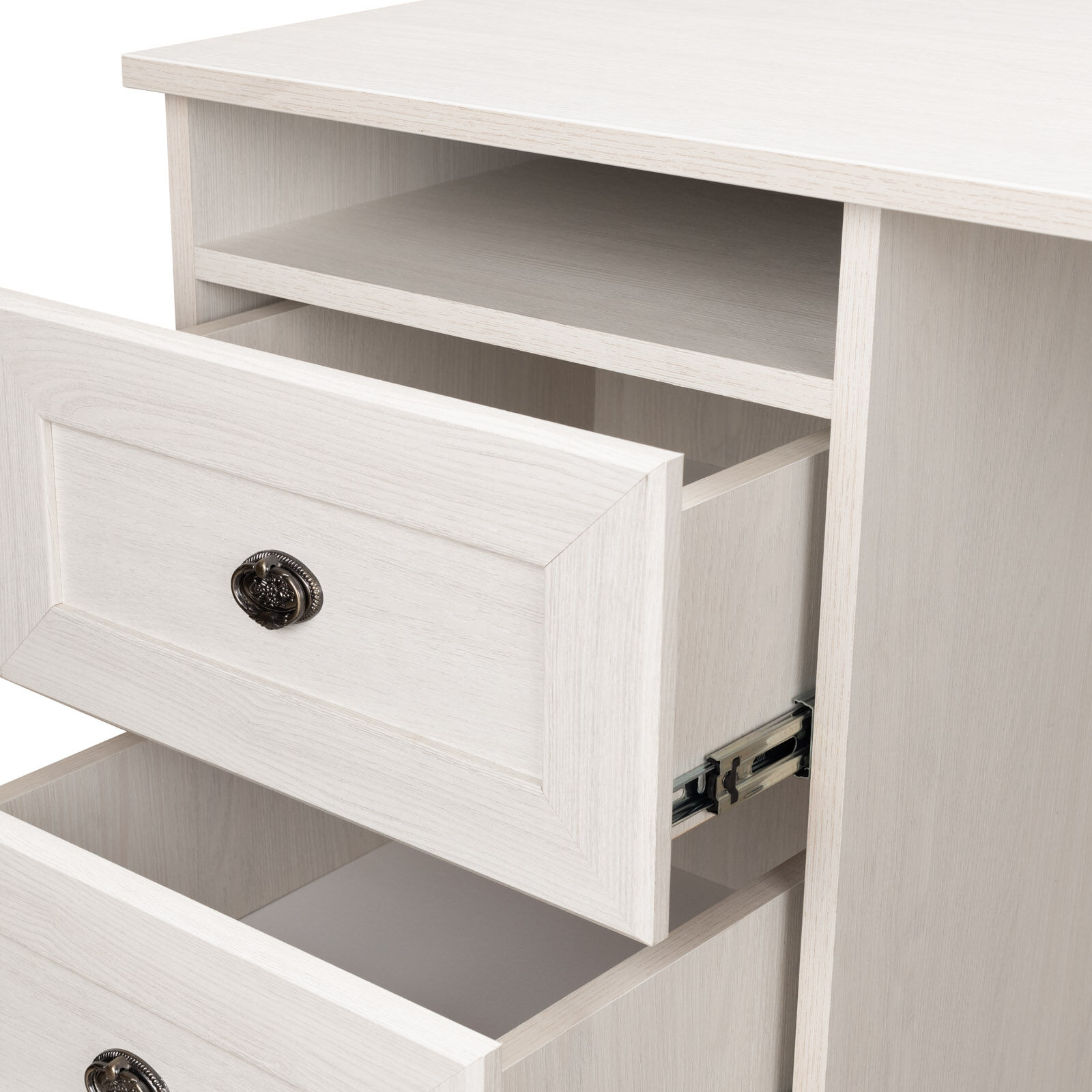 Cтол письменный « ADELE 84» одинаково удобен как для левши, так и для правши за счет просторной рабочей поверхности, а также возможности левосторонней и правосторонней сборки. Высота выдвижных ящиков на роликовых направляющих составляет 14 см: этого достаточно для хранения письменных принадлежностей. «Мебель поставляется в разобранном виде».