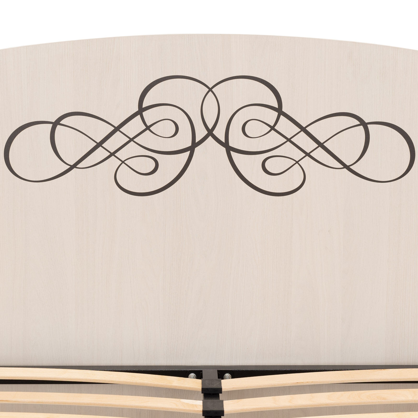 Фигурное изголовье кровати ADELE выгодно подчеркивается толстыми (50 мм) кроватными опорами из МДФ. Изящный вензельный рисунок шоколадного цвета в соответствии с цветом опор нанесен с помощью УФ-печати. Данный метод нанесения гарантирует экологичность, долговечность использования и устойчивость к истиранию. «Матрас в комплект не входит». «Мебель поставляется в разобранном виде».