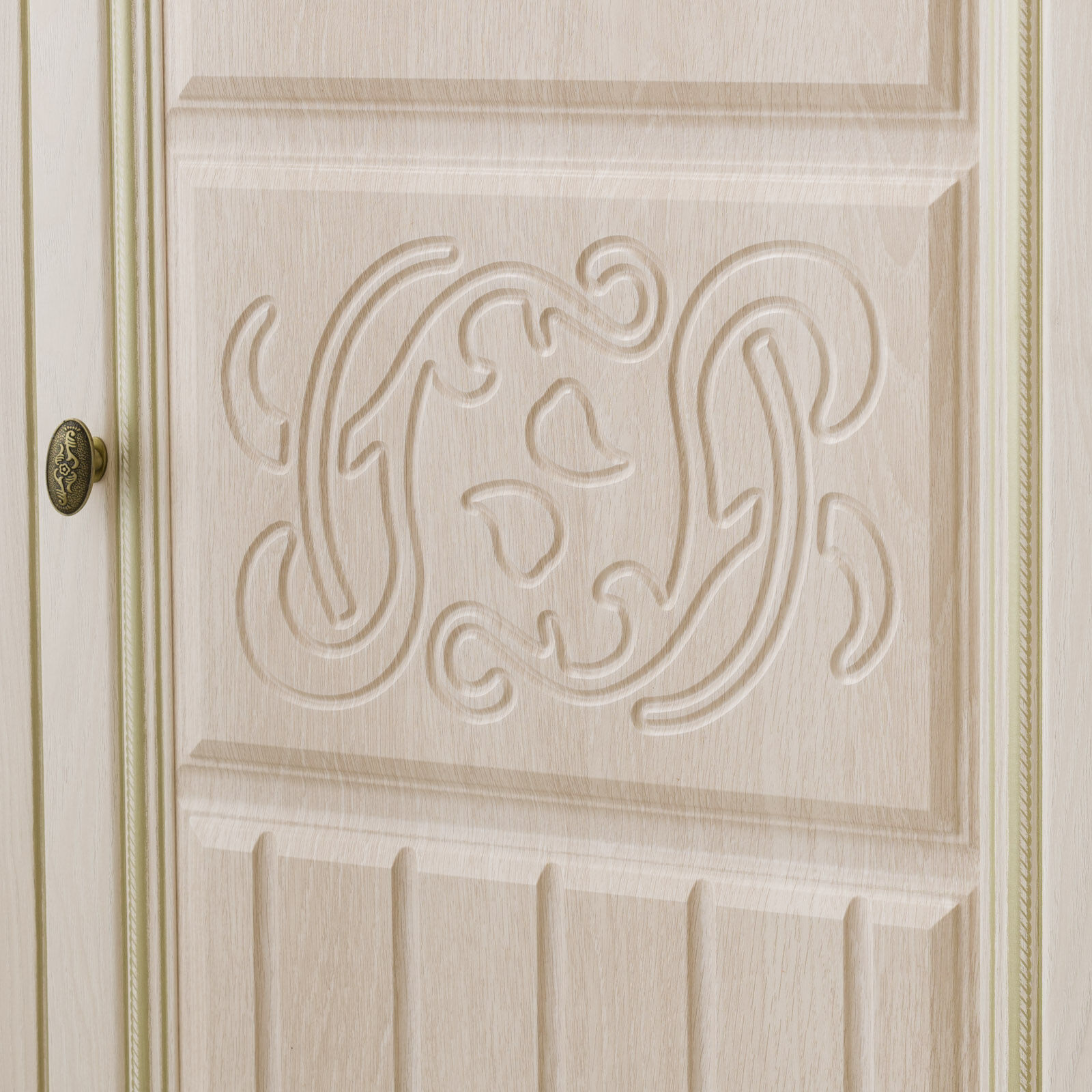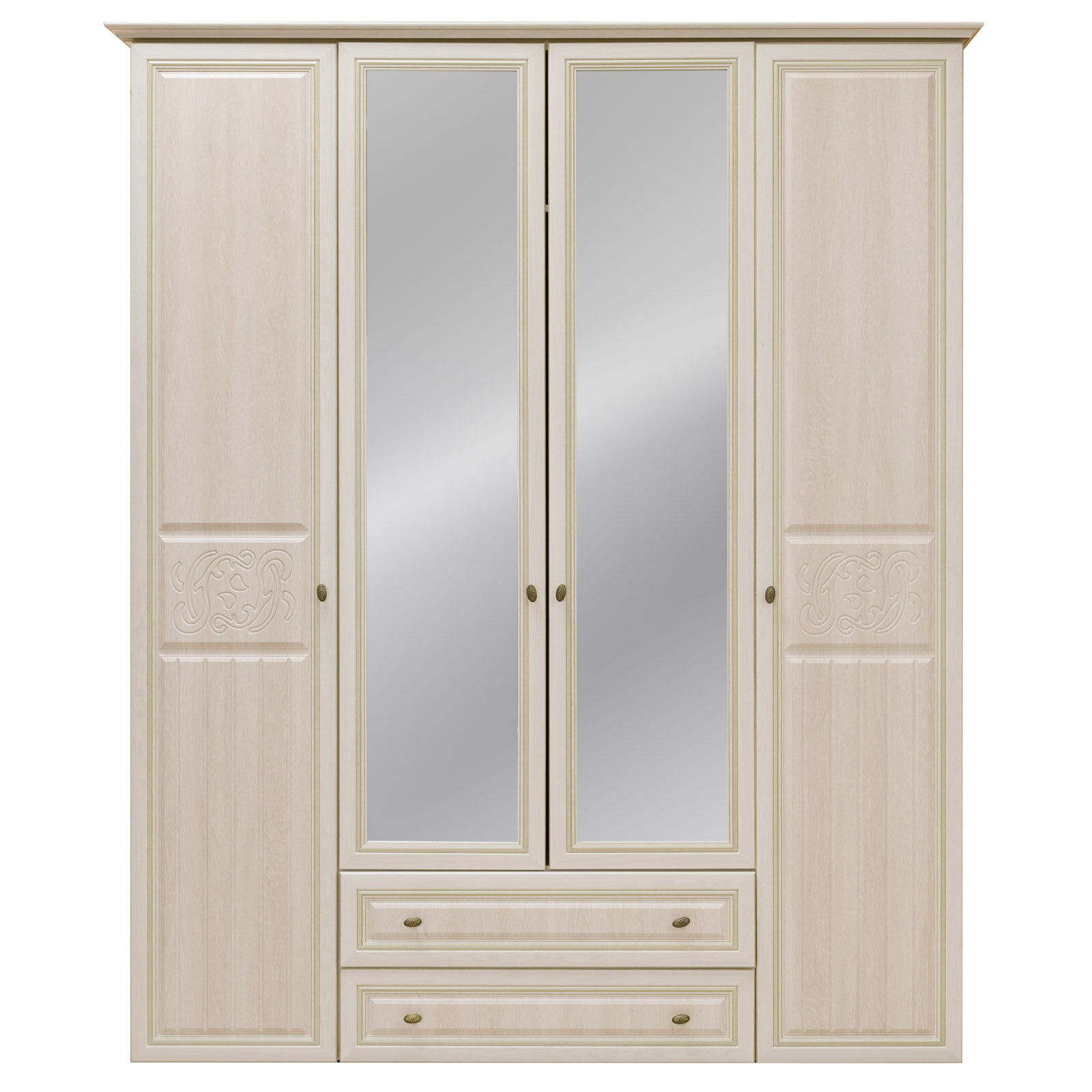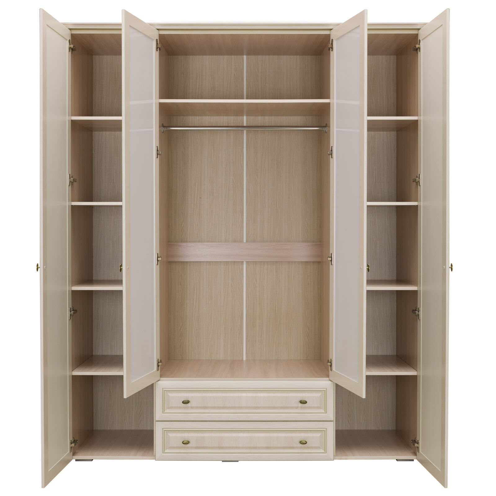 Удобный и стильный четырехстворчатый шкаф «Виктория» придаст уюта любой спальне или гостиной. Интересный дизайн этой модели придает фрезеровка. А большие зеркала визуально увеличат комнату. Внутри четырехстворчатого шкафа «Виктория» одна антресольная полка и штанга по центру, а по бокам - по пять полок. Под створками с зеркалами есть два выдвижных ящика. «Мебель поставляется в разобранном виде».