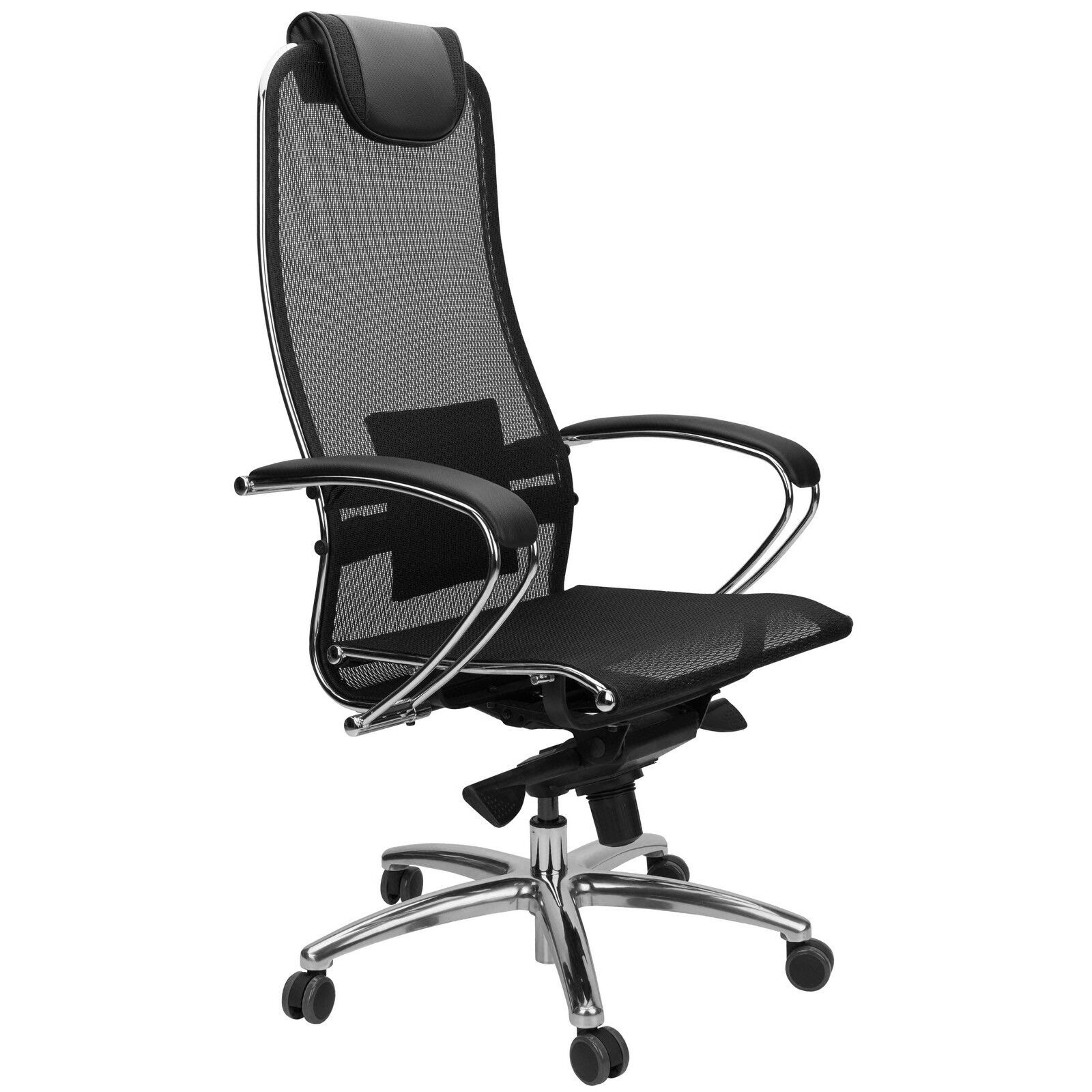 Кресло Samurai S-1 02. Преимущества: абсолютно эргономичная форма спинки соответствует анатомической форме тела человека, которая придает креслу устойчивость при максимальном отклонении. Двухзонная регулировка подпора поясницы обеспечивает идеальную поддержку спины независимо от комплекции сидящего. Сверхпрочный стальной каркас спинки и сиденья, покрытый зеркальным хромом. Синхромеханизм качания MULTIBLOCK, благодаря раздельному синхронному отклонению спинки и сиденья, позволяет телу периодически разгибаться, что улучшает кровоток и разминает мышцы спины. Возможность фиксации кресла в любом положении отклонения. Смещенный вперед центр качания позволяет стопам сидящего, при отклонении кресла, оставаться на полу, сосуды не пережимаются - сохраняется ощущение легкости в ногах. Регулировка глубины сиденья с помощью специального слайдера, обеспечивает эргономически правильную посадку пользователя в кресле, создавая дополнительный комфорт и удобство. Предусмотрена возможность фиксации глубины сиденья в пяти позициях. Противооткатные полиуретановые ролики обеспечивают дополнительную безопасность эксплуатации кресла: без нагрузки - предотвращают случайное перемещение кресла, при сидении - позволяют легко перемещаться. Ролики долговечные, бесшумные, не оставляют следов и царапин на полу, увеличенного диаметра (60 мм). Подголовник: мягкий комфортный из перфорированного износостойкого материала NewLeather (кожа). Подлокотники: стальные, покрытые зеркальным хромом, с мягкими накладками из износостойкого материала NewLeather (кожа). Материалы обивки спинки и сиденья - сверхпрочная сетчатая ткань, армированная арамидным волокном, которая позволяет Вашему телу свободно «дышать», сохраняя температурный баланс, исключая любые зоны перегрева в местах соприкосновения. «Мебель поставляется в разобранном виде».