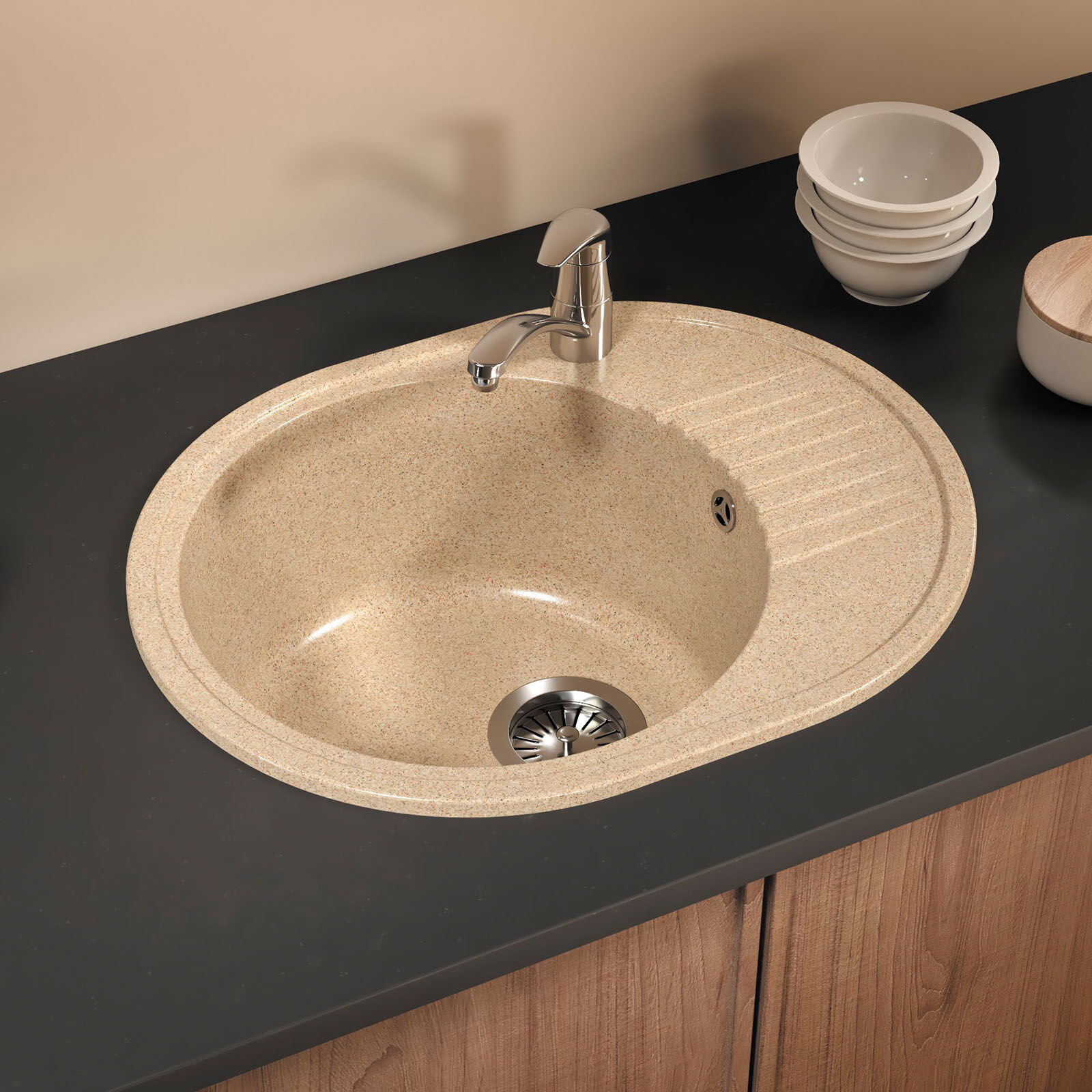 Овальная форма в интерьере кухни смотрится особенно хорошо, и поэтому кухонная мойка «POLYGRAN F-22 бежевый №27» пользуется большим спросом на протяжении многих лет. В этой модели легко поместятся кухонные аксессуары, такие как дозатор или кран фильтра. Купить мойку из искусственного камня стоит хотя бы потому, что даже через 10 лет она будет иметь первоначальный вид. Ей не страшны перепады температуры, она совершенно не шумит при мытье и легко моется бытовой химией. «В комплект входит: инструкция по установке, набор сливной арматуры с нержавеющим клапаном, сифон».