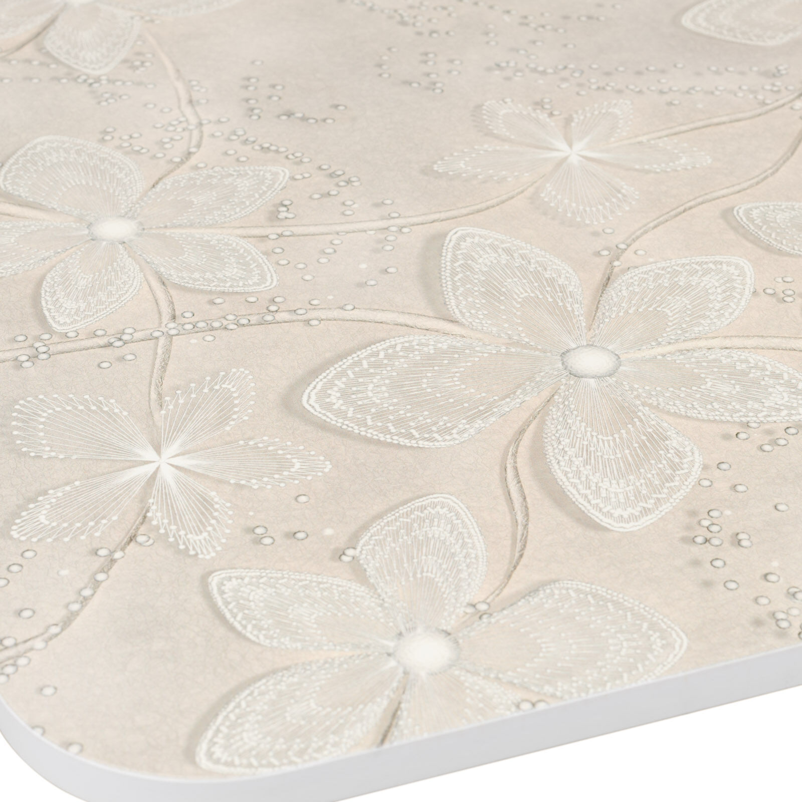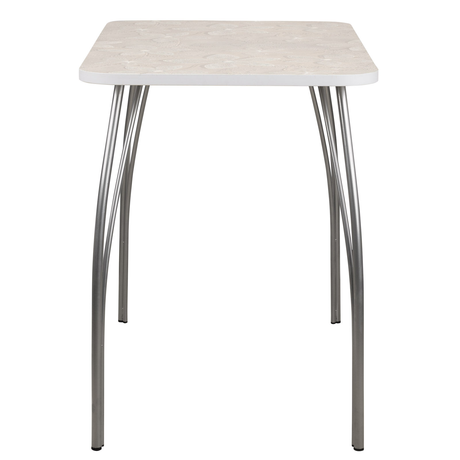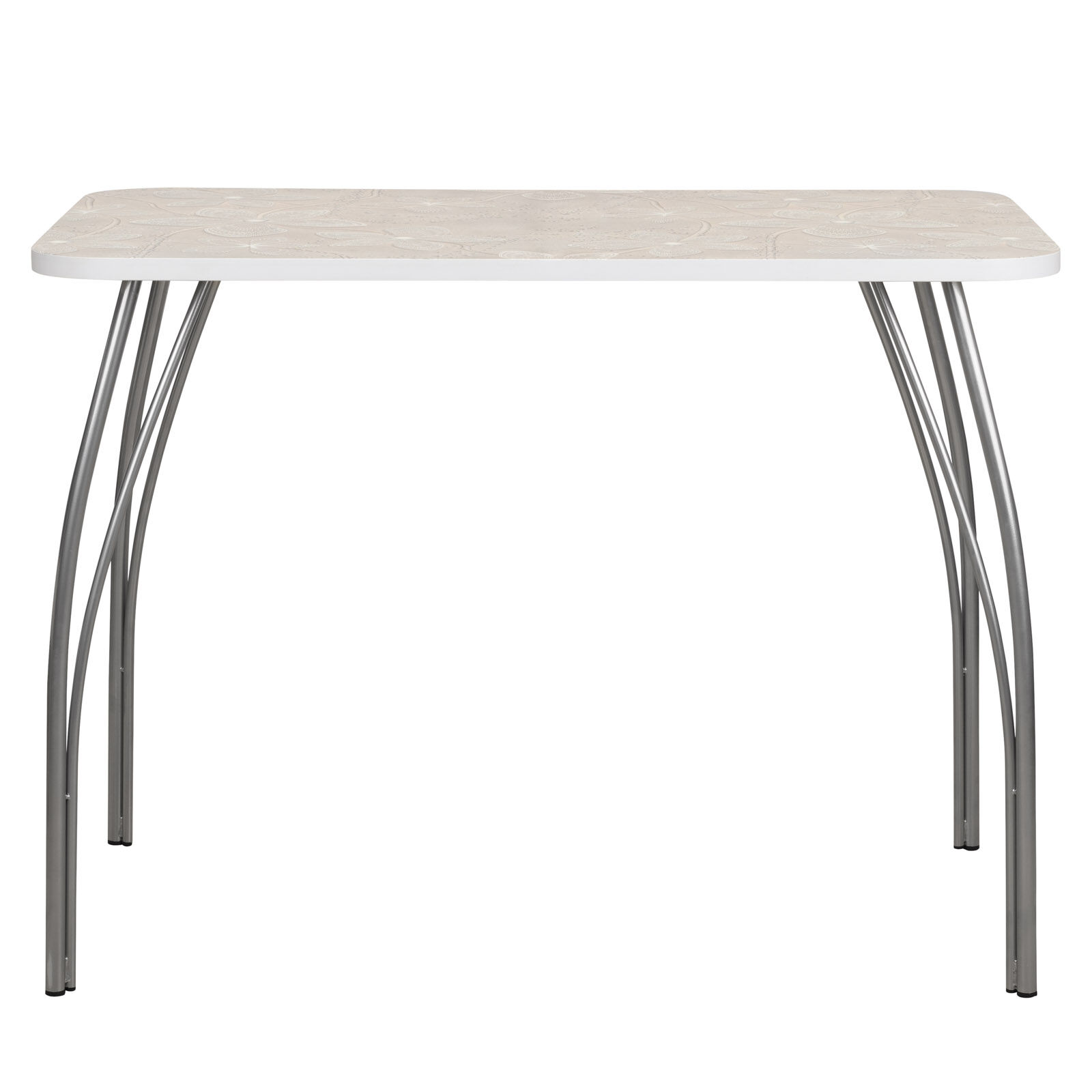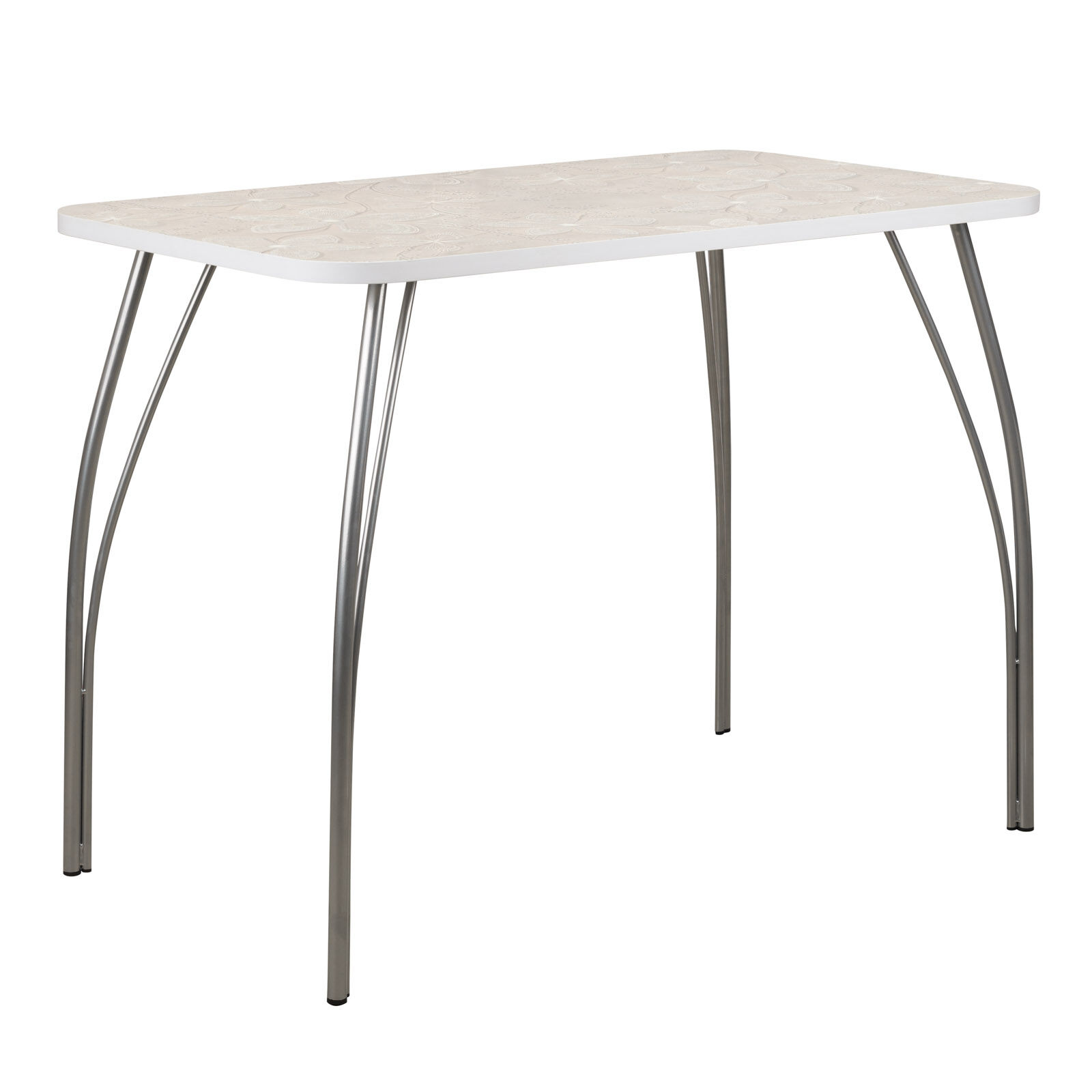 Лилия Кружево - стол обеденный с УФ-печатью. Гармоничное сочетание современного дизайна, функциональности и эргономичности. Оборудован нераскладной прямоугольной столешницей со скругленными углами, выполненной из термостойкого пластика. Установлен на гнутые металлические ножки-опоры (окрас Серебро). Поверхность столешницы декорирована красивым рисунком, нанесенным посредством УФ-печати. «Мебель поставляется в разобранном виде».