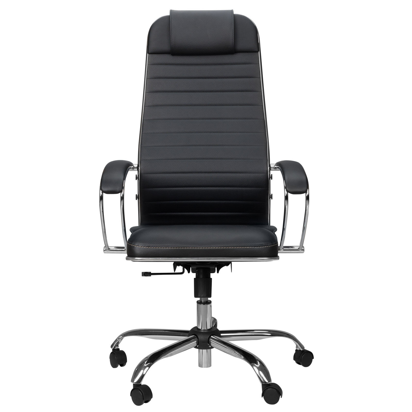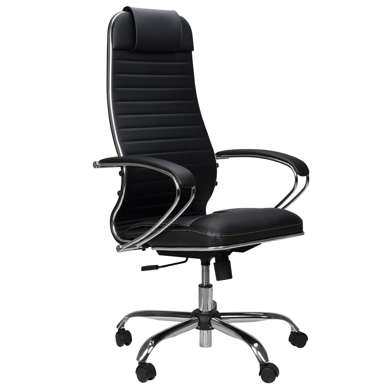 Кресло SU-1-BK кожа/черный Ch №6 - базовая модель Модульной линейки офисных кресел серии «S», сочетающая в себе необходимые настройки, эргономичную форму, соответствующую анатомической форме человека, современный дизайн и максимальный комфорт по доступной цене. Отличительные особенности: стальной каркас спинки и подлокотников с износостойким полимерным покрытием черного цвета. Высокая замкнутая сверху спинка кресла с мягким накладным подголовником. Обивка спинки и сиденья - износостойкий, перфорированный материал (кожа) NewLether многослойный. Преимущества: абсолютно эргономичная анатомически правильная форма спинки и сиденья. Регулируемый поясничный подпор. Уникальная форма передней части сиденья исключает сдавливание сосудов ног, сохраняя ощущение легкости в ногах. Механизм качания дает возможность отклоняться в кресле, настраивать жесткость качания и зафиксировать его в рабочем положении. Регулировка высоты сиденья. Регулировка глубины сиденья за счет перемещения места крепления сидения. Комфортные классические подлокотники с износостойким полимерным покрытием (зеркальный хром) и мягкими накладками из искусственной кожи. Пятилучье - хромированный металл. «Мебель поставляется в разобранном виде».