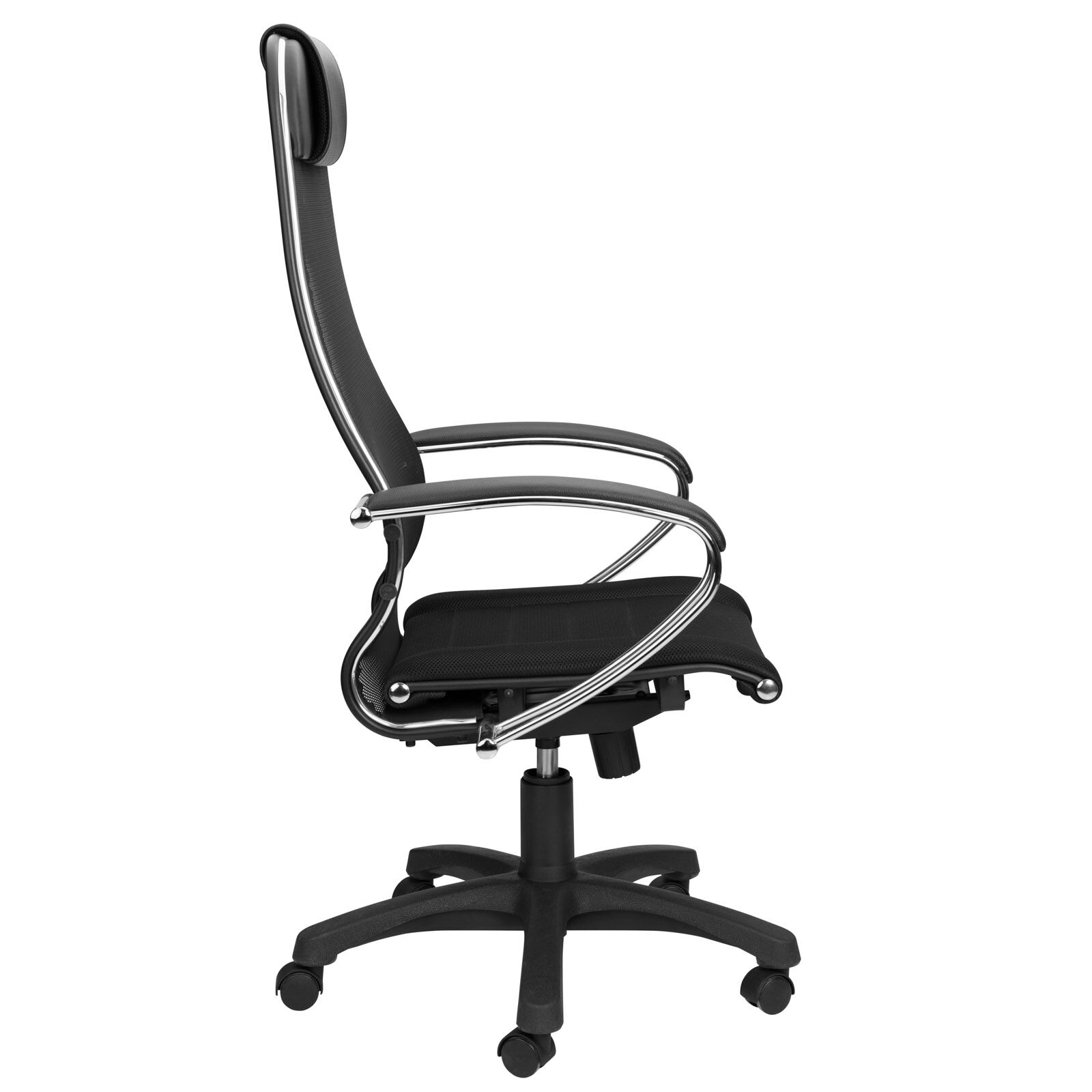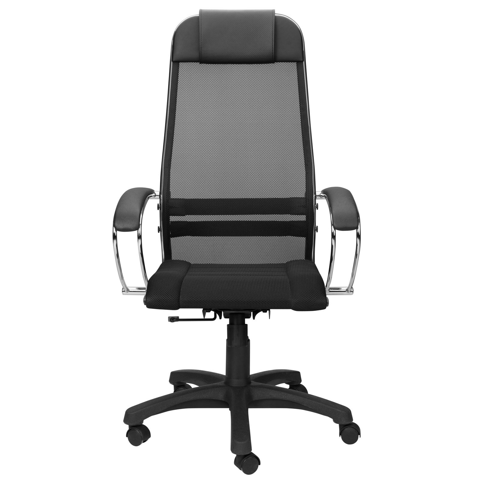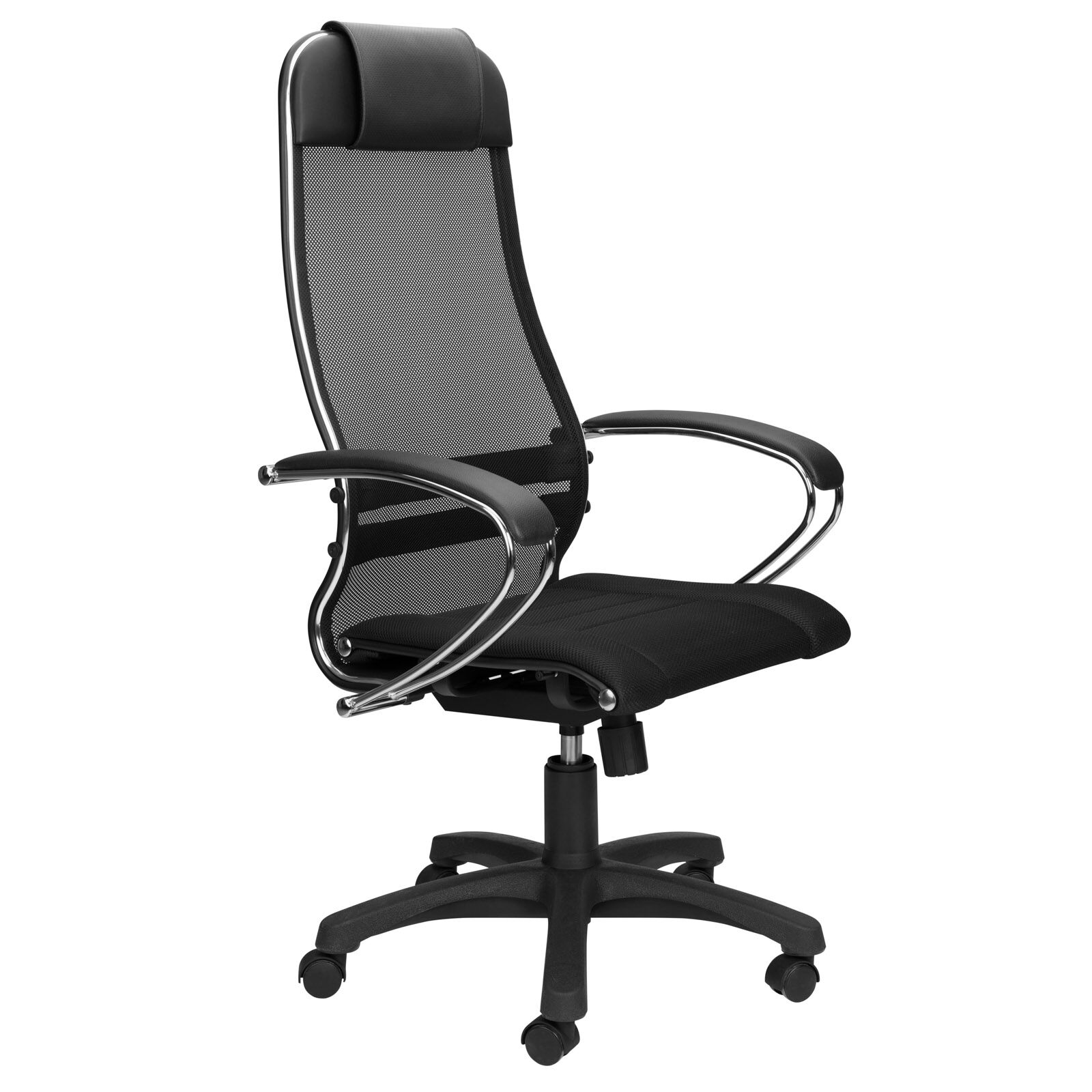 Офисное кресло BK-8PL обито полимерной тканью-сеткой повышенной прочности. Хромированные подлокотники выполнены из стали. Они имеют мягкие накладки из качественной экокожи. Цельный стальной каркас отличает специальное покрытие из износостойкого полимерного материала под цвет черного пластика. Механизм качания Top Gun позволяет зафиксировать черное офисное кресло в требуемом положении. Он работает на шариковых подшипниках. Благодаря этому механизм отличается бесшумностью и долговечностью. Кресло поддерживает человека в тонусе. При этом снижается риск развития заболеваний опорно-двигательной системы. «Мебель поставляется в разобранном виде».