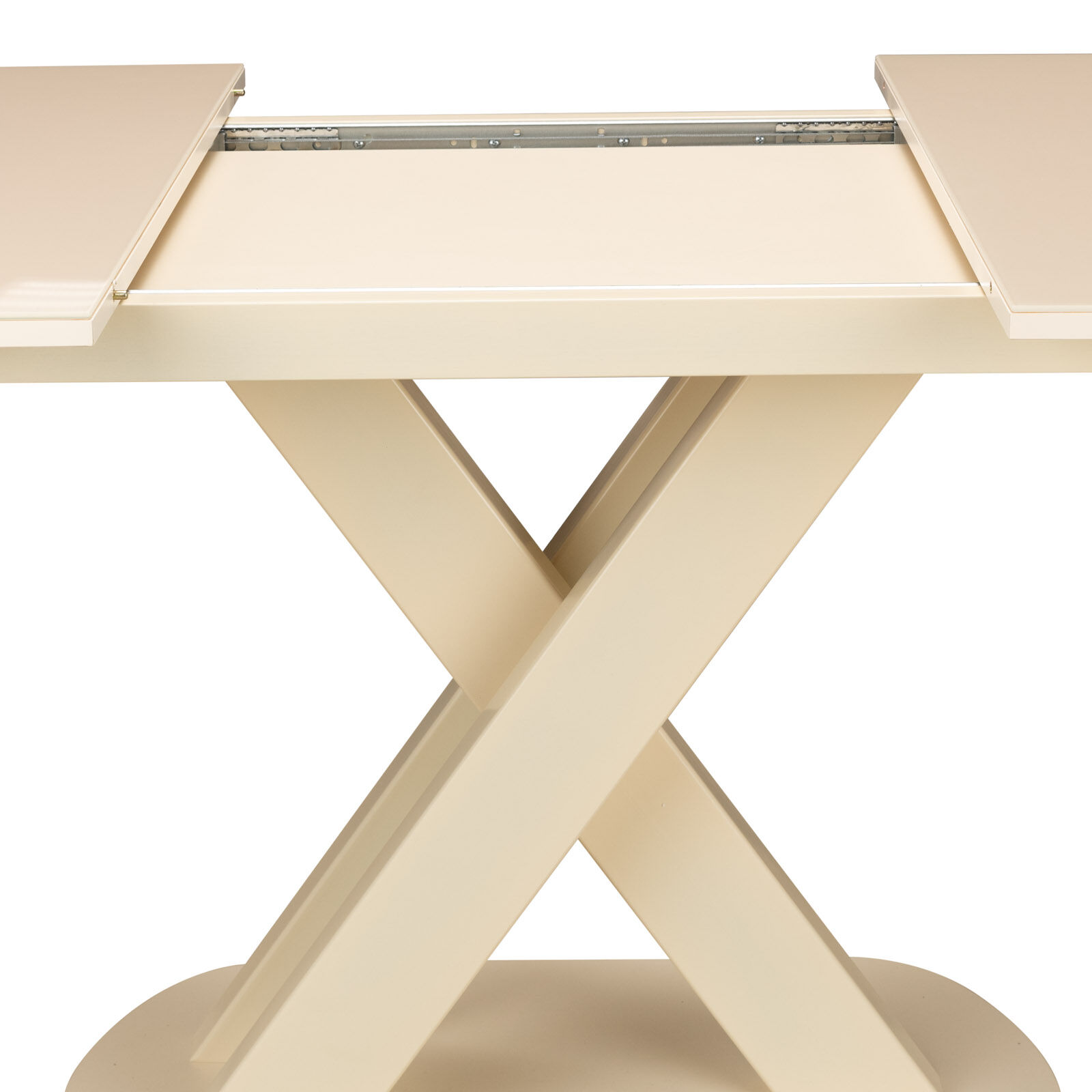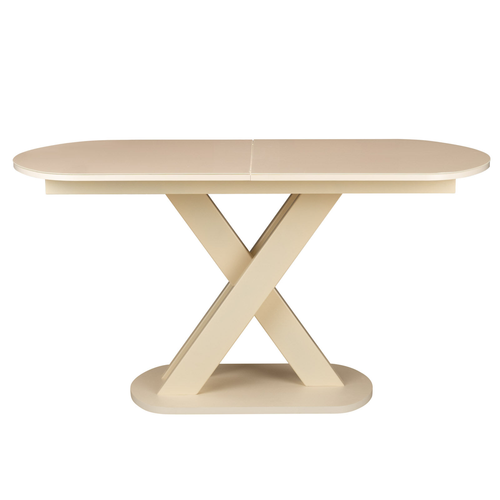 Стол раздвижной Лесет Лесь кремового цвета, выполнен в современном стиле. Столешница сделана из закаленного стекла овальной формы. Опорой выступает Х-образная металлическая конструкция из трех реек, закрепленная на нижней платформе.
