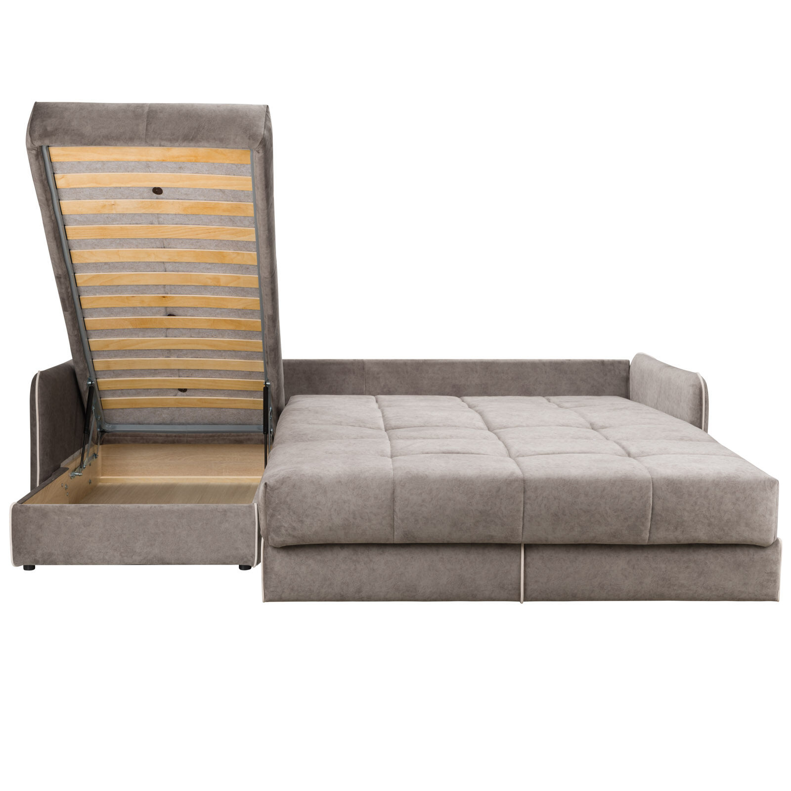 Аккуратный, без лишних деталей, продуманный до мелочей дизайн. Выкатная часть дополнительно снабжена специальными роликами с особым покрытием, предохраняющим напольное покрытие от царапин. Съемная чехловая система облегчает уход за обивкой дивана и ее замену. Специальная простежка чехла не позволяет дивану утратить свою форму в процессе эксплуатации. Металлический каркас. Бельевой ламинированный ящик в оттоманке.