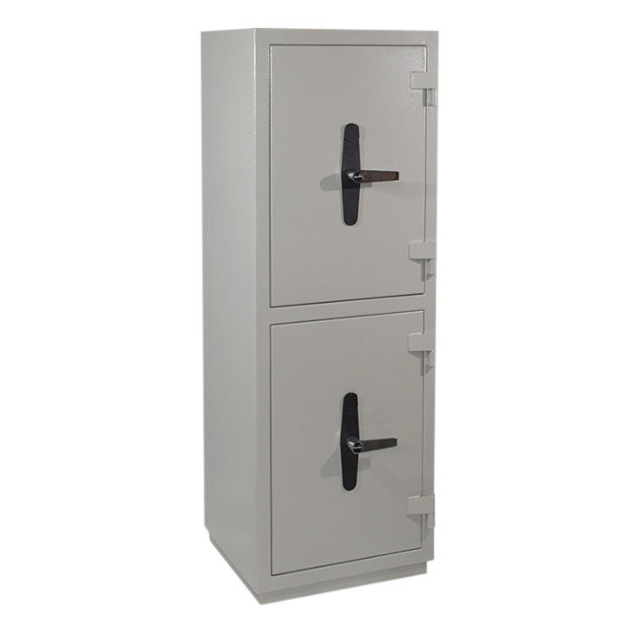 Двухсекционный сейф КЗ-233т предназначен для хранения документов и ценностей дома и в офисе. Сейф имеет 2 независимых отделения, запираемых собственной дверью. В верхнем отделении располагается отсек ограниченного доступа (трейзер), запираемый на замок «почтового» типа и одна полка, в нижнем – одна полка. В дне сейфа предусмотрено отверстие Ø11 мм для возможности анкерного крепления его к полу. Каждая дверь сейфа оборудована запорным механизмомс 2-х сторонней ригельной системой запирания (по 3 ригеля Ø28 мм вправо-влево), который блокируется ключевым сейфовым замком класса «А» фирмы «CAWI» или «MAUER» производства Германии. Запорный механизм приводится в действие при помощи ручки. Чтобы открыть сейф необходимо: вставить ключ в замочную скважину, открыть замок и повернуть ручку на 90°. Закрывать в обратном порядке. Петли сейфа наружные, открывание двери – на 180°.