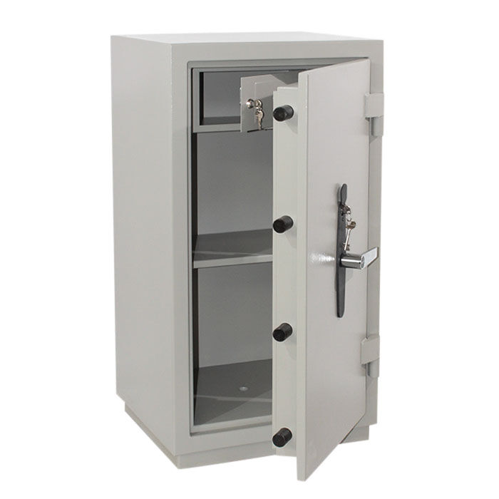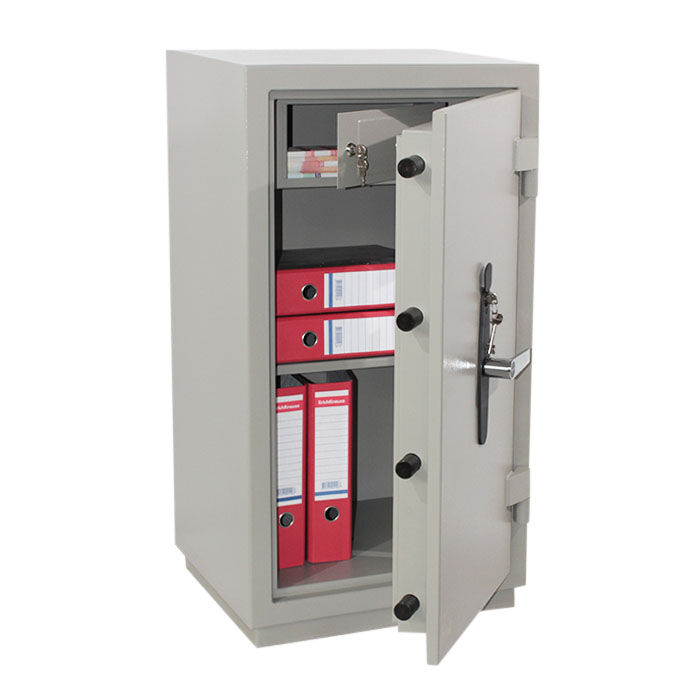 Сейф КЗ-045 Т — предназначен для безопасного хранения документов и ценных бумаг. Внутри сейфа «КЗ-45 Т» асполагается отсек ограниченного доступа (трейзер), запираемый на замок «почтового» типа и одна полка. В дне сейфа предусмотрено отверстие Ø11 мм для возможности анкерного крепления его к полу. Дверь сейфа оборудована запорным механизмомс 2-х сторонней ригельной системой запирания (4 ригеля + пассивный П-образный ригель со стороны петель), который блокируется ключевым сейфовым замком класса «А» фирмы «CAWI» или «MAUER» производства Германии. Запорный механизм приводится в действие при помощи ручки. Чтобы открыть сейф необходимо: вставить ключ в замочную скважину, открыть замок и повернуть ручку на 90°. Закрывать в обратном порядке. Петли сейфа наружные, открывание двери – на 180°.