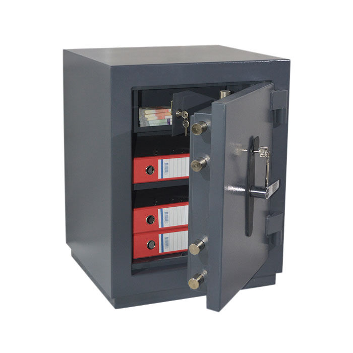 М Сейф ТК-10т - взломостойкий. Корпус сейфа изготовлен из цельнометаллических сваренных корпусов (внешний и внутренний) с наполнением. Пространство между корпусами заполнено специальным наполнителем, обеспечивающим надежность и прочность конструкции. Система запирания двери имеет 6 активных и один пассивный ригель со стороны петель. Сейф оборудован высококачественным запорным механизмом, который блокируется замком сувальдного типа, что обеспечивает необходимую для третьего класса надежность от взлома. Внутри сейфа имеется отсек ограниченного доступа — трейзер (внутренний ящик с замком почтового типа) и 1 полка. Предусмотрена возможность анкерного крепления к полу. Окраска полимерное покрытие.