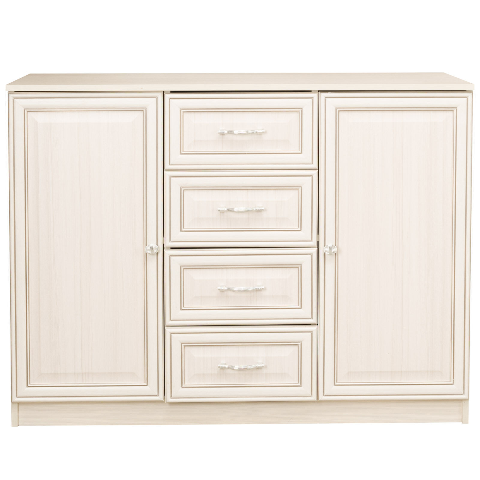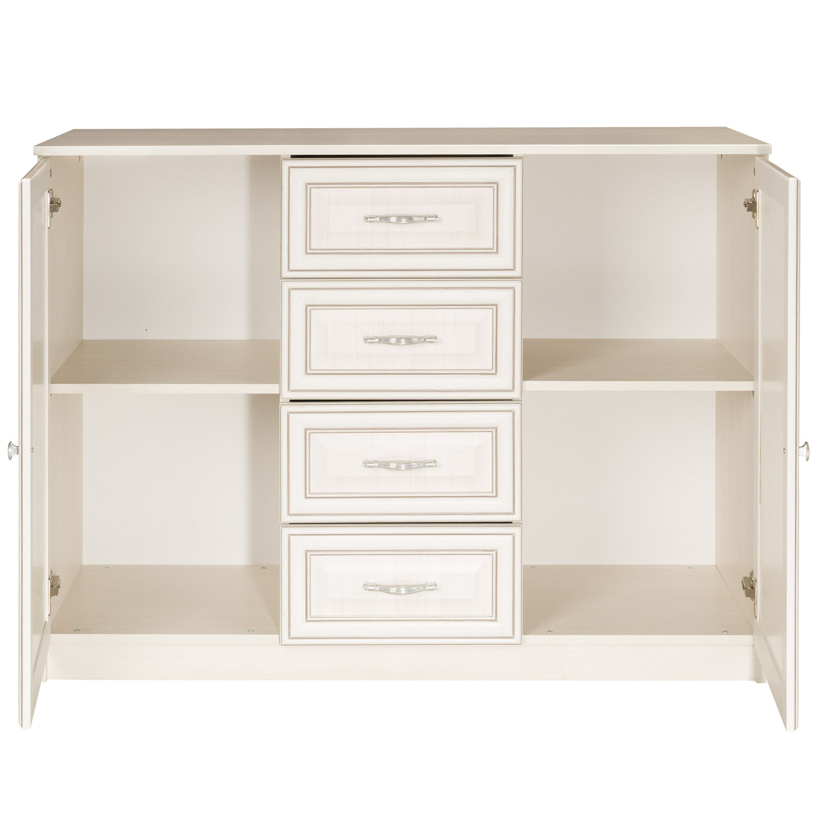 Эффектный, удобный, многофункциональный комод, имеет 4 выдвижных ящика и два отсека с полками.
